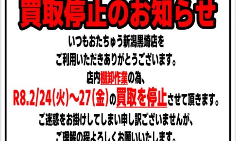 お知らせ★いつもおたちゅう新潟黒埼店をご利用頂きありがとうございます。 2026年1月21日からの営業時間変更に伴い、買取受付時間も変更させて頂きます。 変更後の買取受付時間は 日/月曜日 12:00~17:00 火/木/金曜日…