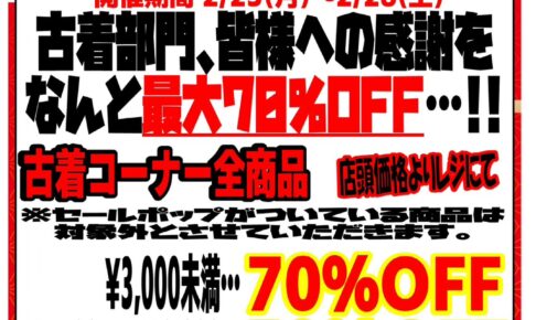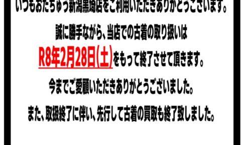 イベント情報いつもおたちゅう新潟黒埼店、古着コーナーをご利用いただき誠にありがとうございます! 古着取り扱い終了にちなんで売り尽くしセールを行います‼️‼️ あれもこれも安い‼️ ぜひご来店お待ちしております‼️