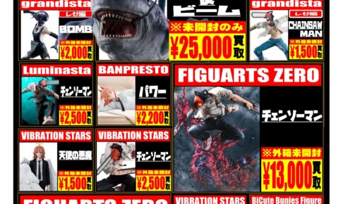 買取情報おもちゃ部門より買取告知3月版を一部更新いたしました! ◯チェンソーマン フィギュア 今月もたくさんのグッズや大人気アミューズメント景品を揃えて皆さまのご来店を心よりお待ちしております! ——————————————— …