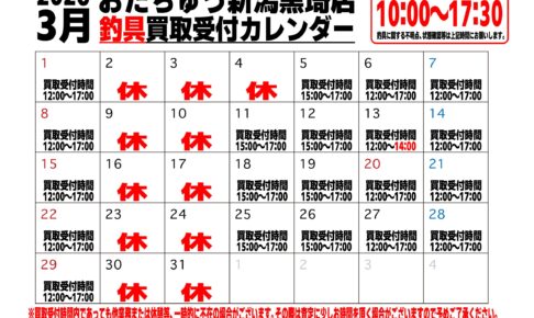 お知らせ3月釣具買取カレンダー更新しました🗓 若干カレンダー不規則な部分がありますのでご注意ください⚠️ また、在籍時間及び買取受付時間中であっても他業務等や休憩等で一時的に不在の場合がございますので予めご了承くだ…