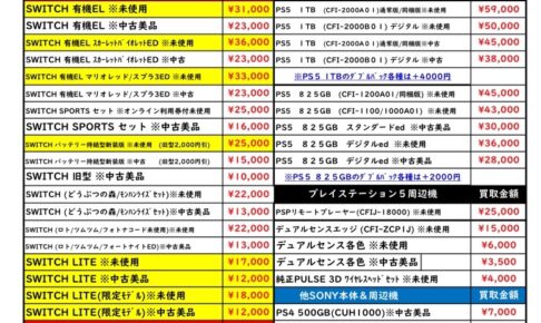 買取情報🎮ゲーム本体周辺機器買取チラシを更新しました🎮 連日たくさんのお持ち込みありがとうございますm(__)m 特に募集しているのは スイッチ各種 ps5各種 です❗️ ぜひ新潟黒埼店にお持ちくださいm(__)m 皆さまのご来…