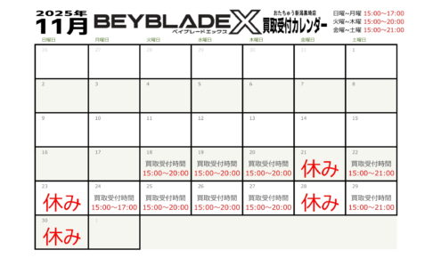 買取情報ベイブレードX11月買取カレンダー更新致しました! お持ち込みの際は、改めてご確認のうえお越しください。 ※予告なく変更となる場合がございます。あらかじめご了承ください。 ※2025/11/18現在の価格と…