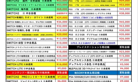 買取情報いつもご来店いただきありがとうございます。 ゲーム機本体未使用品買取チラシや、その他色々更新しました❗️ ぜひ新潟黒埼店にお持ちください❗️ 皆さまのご来店お待ちしてますm(__)m ※2025/7/1現在の価格となりま…