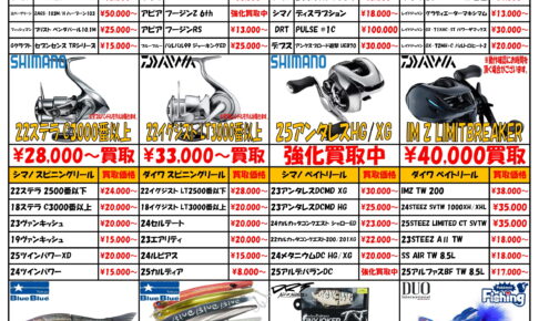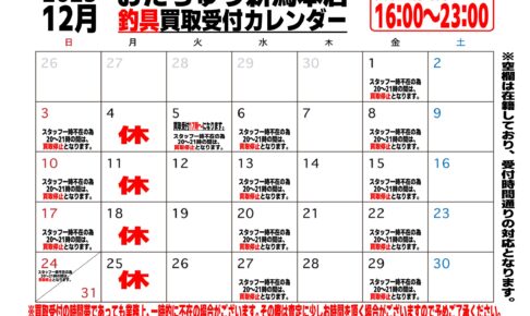 買取情報111/21〜より勤務時間変更に伴い、 釣具買取カレンダーを変更させて頂きました。🗓 11/26以降は決まり次第、公式HP及びインスタグラムにてお知らせ致します。 また、買取受付時間中であっても他業務等で一…
