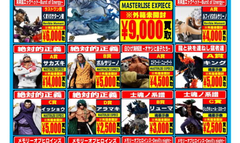 買取情報買取告知1月版を一部更新いたしました! ◯ワンピース一番くじ ◯鬼滅の刃一番くじ ◯鬼滅の刃プライズ ◯ガンプラMGシリーズ ◯ガンプラRGシリーズ ◯METALROBOT魂〈SIDE MS〉 今月もたくさんのグッズや大…
