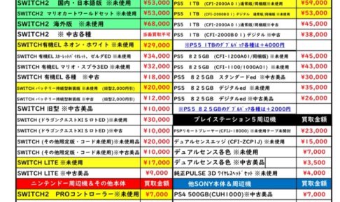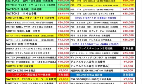 買取情報いつもご来店いただきありがとうございます。 ゲーム機本体未使用品買取チラシや、その他色々更新しました❗️ ぜひ新潟黒埼店にお持ちください❗️ 皆さまのご来店お待ちしてますm(__)m ※2025/7/1現在の価格となりま…