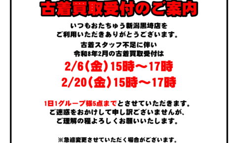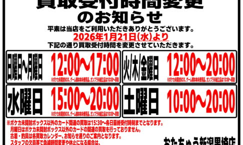 お知らせ★いつもおたちゅう新潟黒埼店をご利用頂きありがとうございます。 2026年1月21日からの営業時間変更に伴い、買取受付時間も変更させて頂きます。 変更後の買取受付時間は 日/月曜日 12:00~17:00 火/木/金曜日…