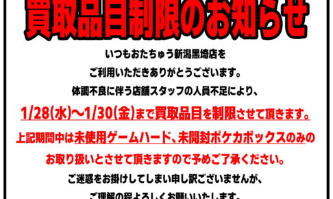 買取情報★1/28~30の買取について★ いつもおたちゅう新潟黒埼店をご利用頂きありがとうございます。 体調不良に伴う店舗スタッフの人員不足により1/28〜30までの買取品目を制限させて頂きます。 期間中は未使用ゲームハード、未…