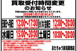 【重要】《1月21日より》買取時間の変更ついて【重... ★いつもおたちゅう新潟黒埼店をご利用頂きありがとうございます。 2026年1月21日からの営業時間変更に伴い、...