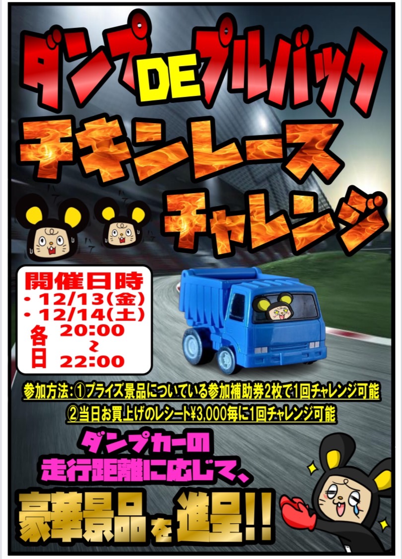 ★今週末は★ 2024年12月10日 2024年12月16日★イベント情報★今週末は 大大大人気の ダンプDEプルバックチャレンジ が帰ってくるよ〜‼️ ダンプカーの走行距離に応じて豪華景品ゲット‼️ プライズ景品についてる補助券2枚か当日3000円のお買い上げレシートで1回参加できます☆なお、今月は21周年でUFOキャッチャー500円6プレイできます&食品の景品ゲット率地域No.1🐶を目指していますのでいつもより参加しやすくなっています✨ 狙って狙って〜〜‼️ 皆さま金曜日土曜日の夜はぜひお待ちしてます☆☆