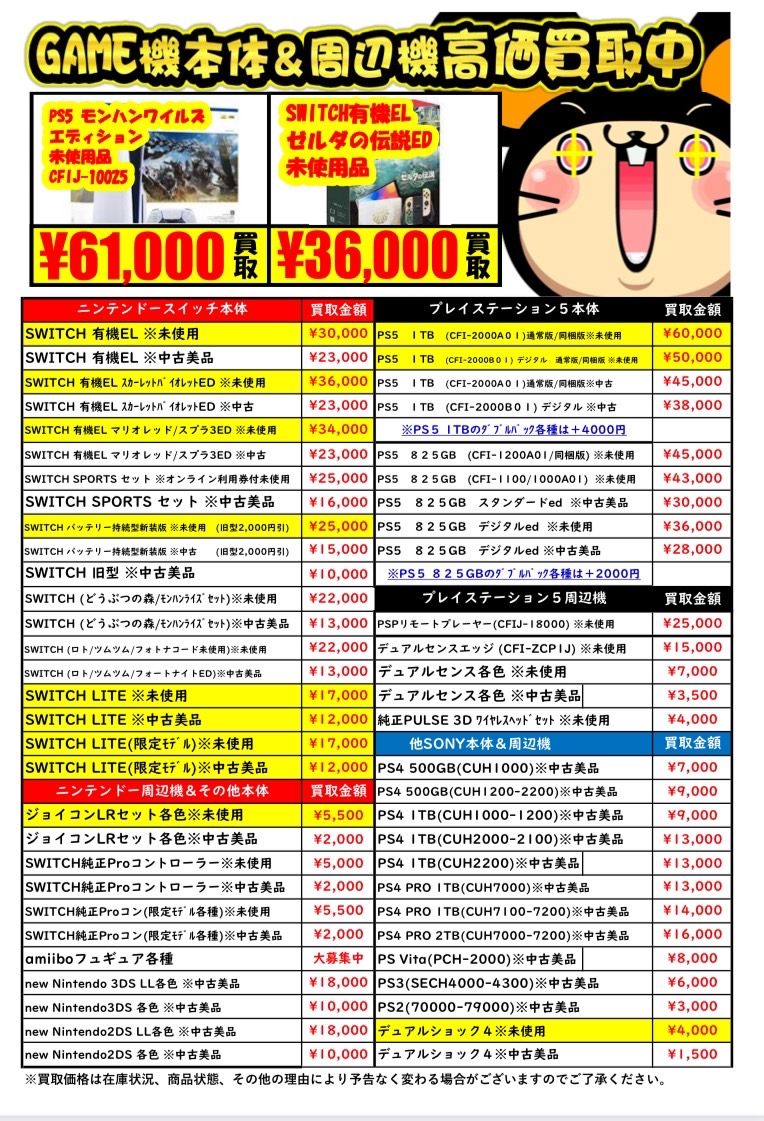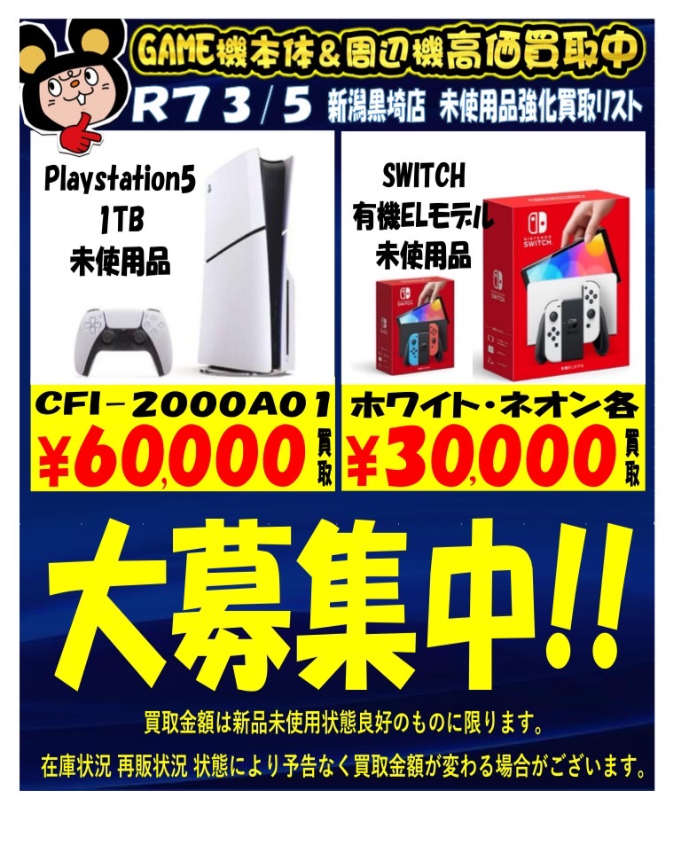 ■ゲーム本体周辺機器買取チラシ更新しました!■ 2025年3月5日連日たくさんのお持ち込みいただきありがとうございます! ゲーム本体周辺機器買取チラシ更新しました! 今回は全体的に幅広く募集中🎯 ぜひ新潟黒埼店にお持ちくださいm(__)m 皆さまのご来店お待ちしてます☆※在庫状況その他の理由により予告なく終了する場合があります。 あらかじめご了承ください。 ※箱傷み等は減額となります。