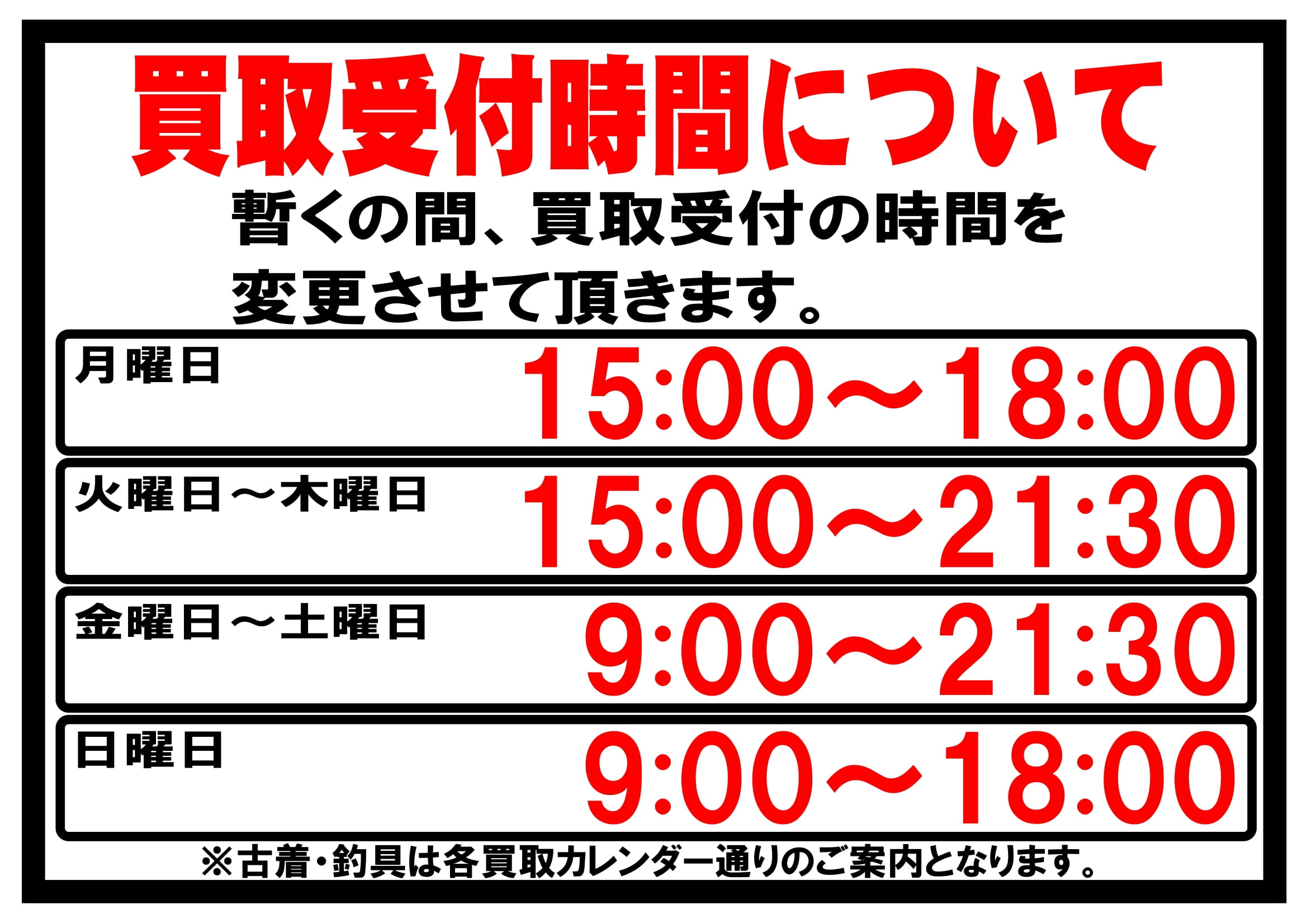 ★《3月24日より》買取時間変更のお知らせ★ 2025年3月22日 2025年5月1日★買取時間変更のお知らせ★日頃よりおたちゅう新潟黒埼店をご利用くださいまして誠にありがとうございます。誠に勝手ではございますが、 3/24(月)より当面の間、一部曜日の買取時間を変更させて頂きます。 お間違いのないようにお願い致します。※古着、釣具は各カレンダー通りの買取時間となります。ご迷惑をお掛けしてしまい申し訳ございませんが、ご理解の程よろしくお願い致します。