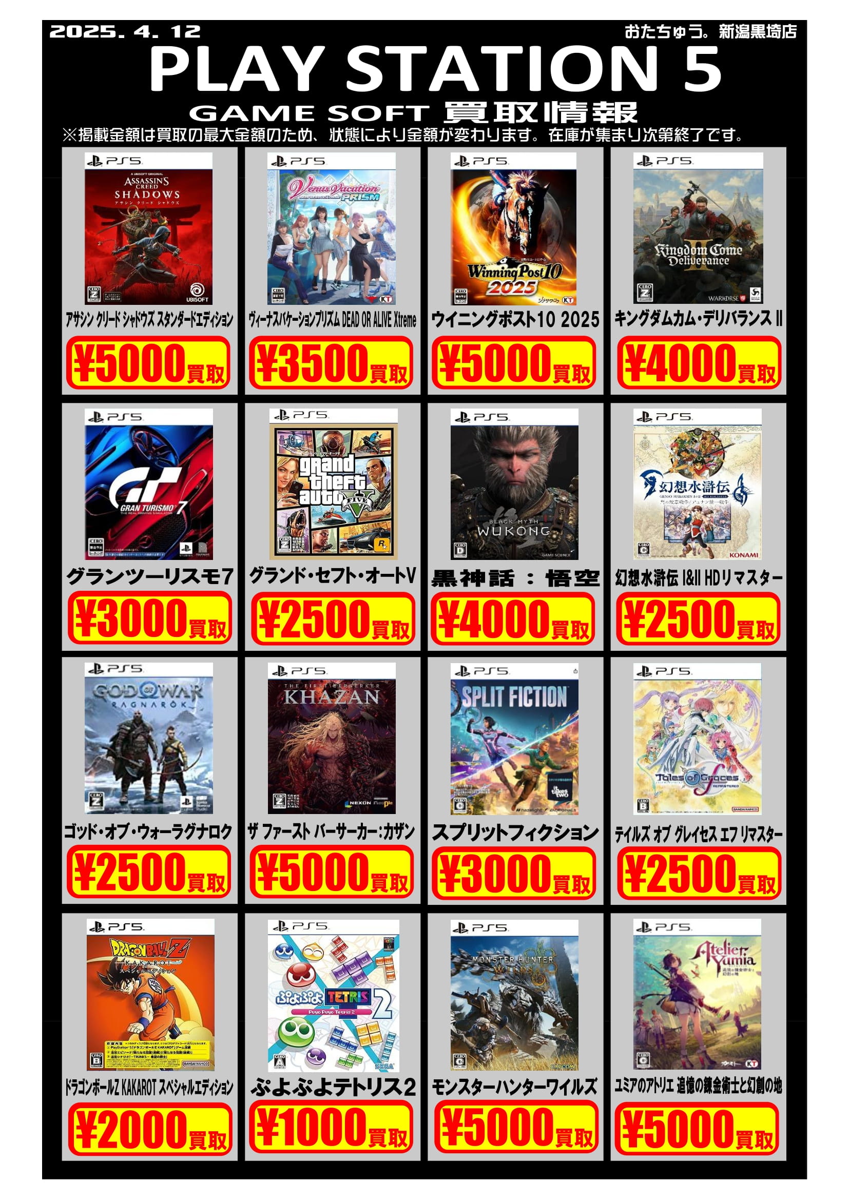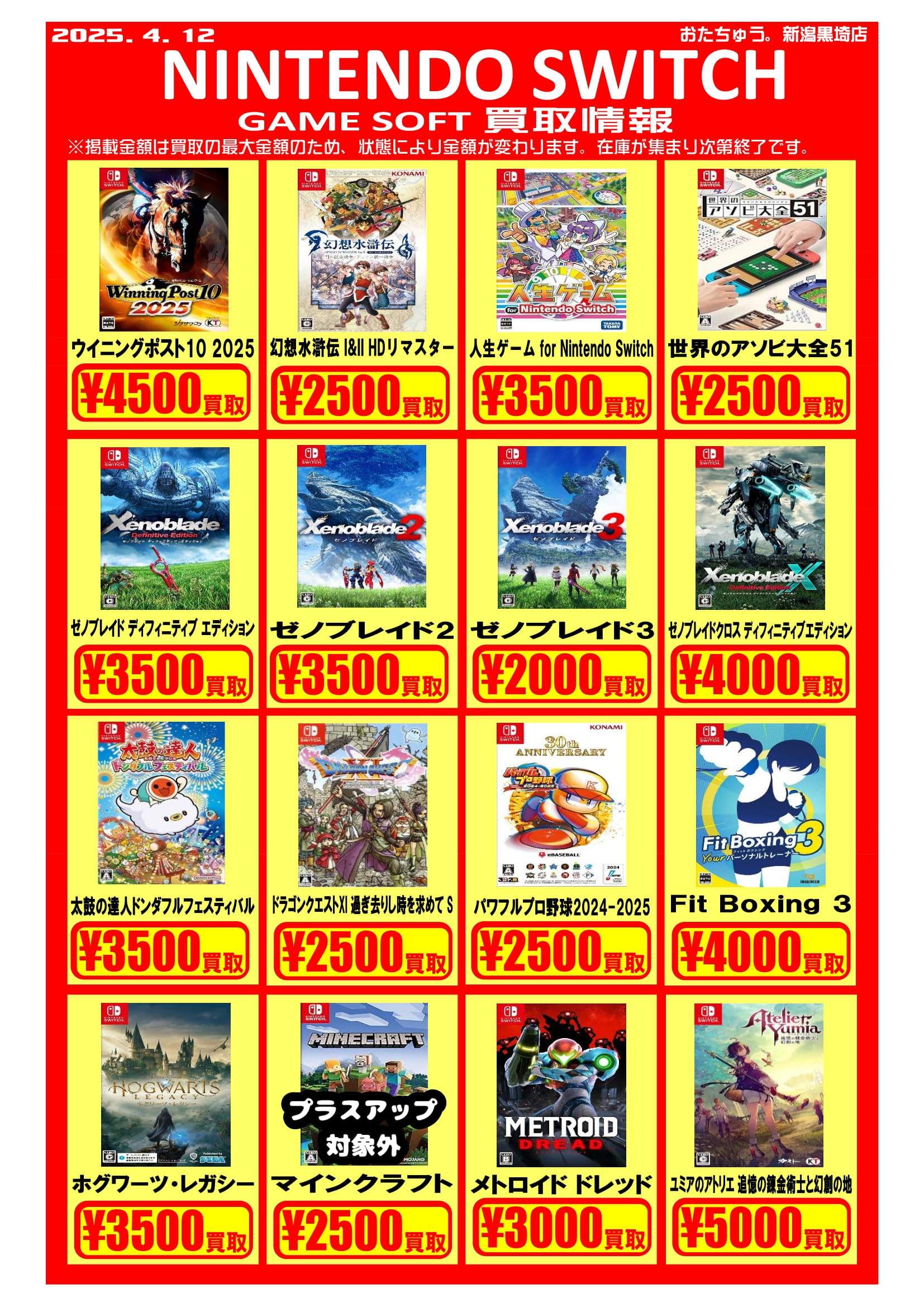 ✨ゲームソフト買取チラシを更新しました✨ 2025年4月12日ゲームソフトの買取チラシを更新いたしました!遊び終わったソフトはぜひおたちゅう新潟黒埼店にお売りください✨ お待ちしております😊 ※2025/4/12現在の価格となります。在庫状況・状態によってお値段が変動いたします。予めご了承ください。****************こちら↓もぜひチェックしてみてくださいね♪(*´▽`*)・最新のイベント情報はこちら・最新の買取情報はこちら