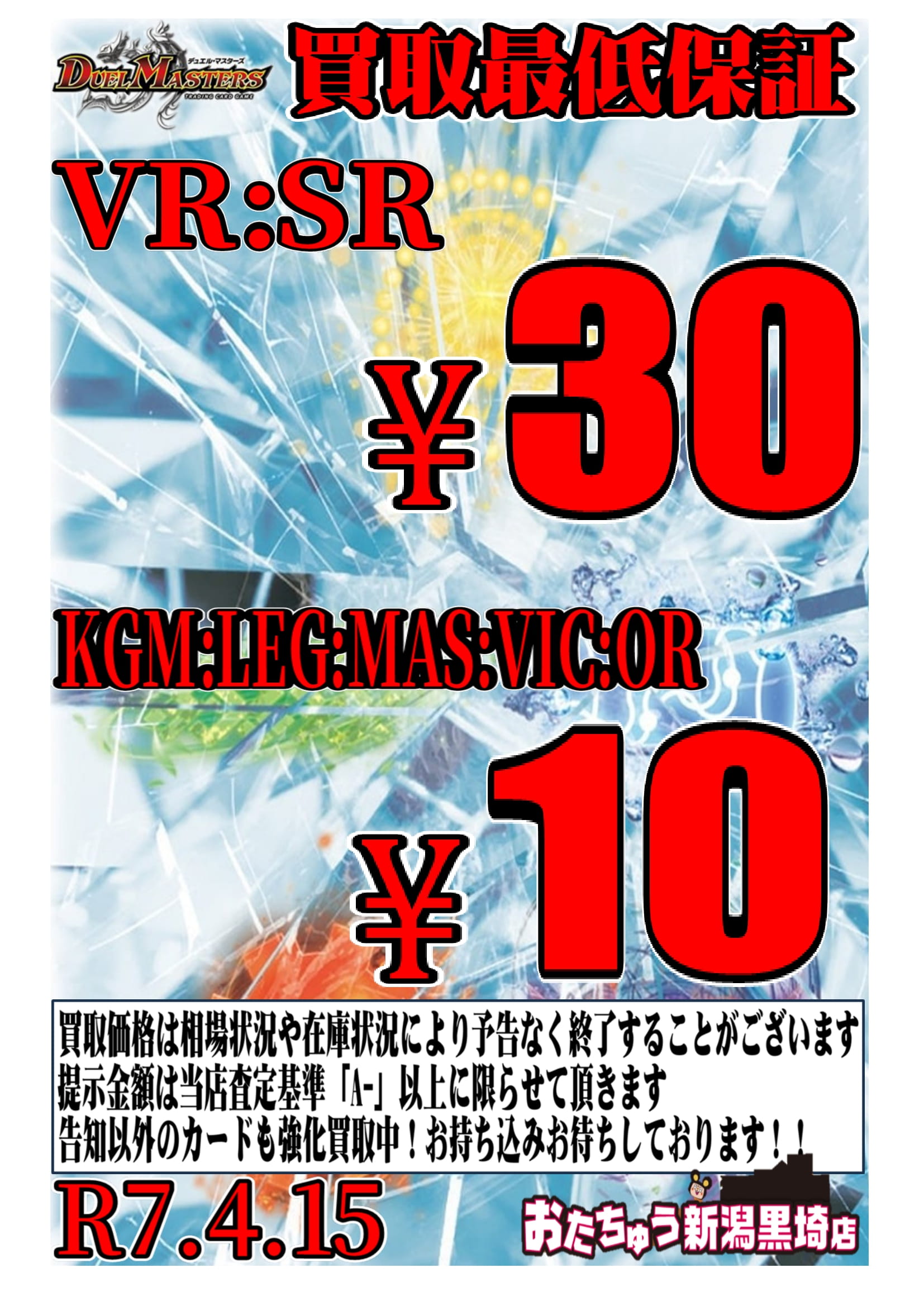◆デュエルマスターズ最低買取保証更新!!◆ 2025年4月15日 急募!求ム! 足りなさすぎるんで皆さん助けてください! 告知商品も告知外の商品も沢山のお持ち込みを心よりお待ちしております!お持ち込みはお早めに! 注意事項 ※在庫状況その他の理由により予告なく終了する場合があります。 あらかじめご了承ください。 皆さまのご来店お待ちしてます‼️※2025/4/15現在の価格となります。****************こちら↓もぜひチェックしてみてくださいね♪(*´▽`*)・最新のイベント情報はこちら・最新の買取情報はこちら