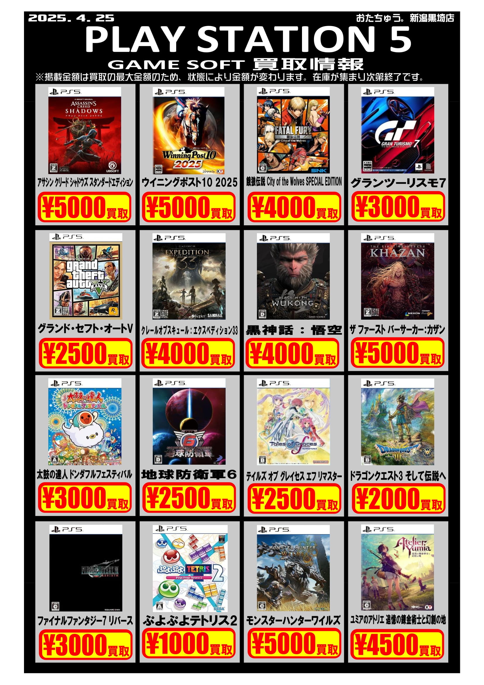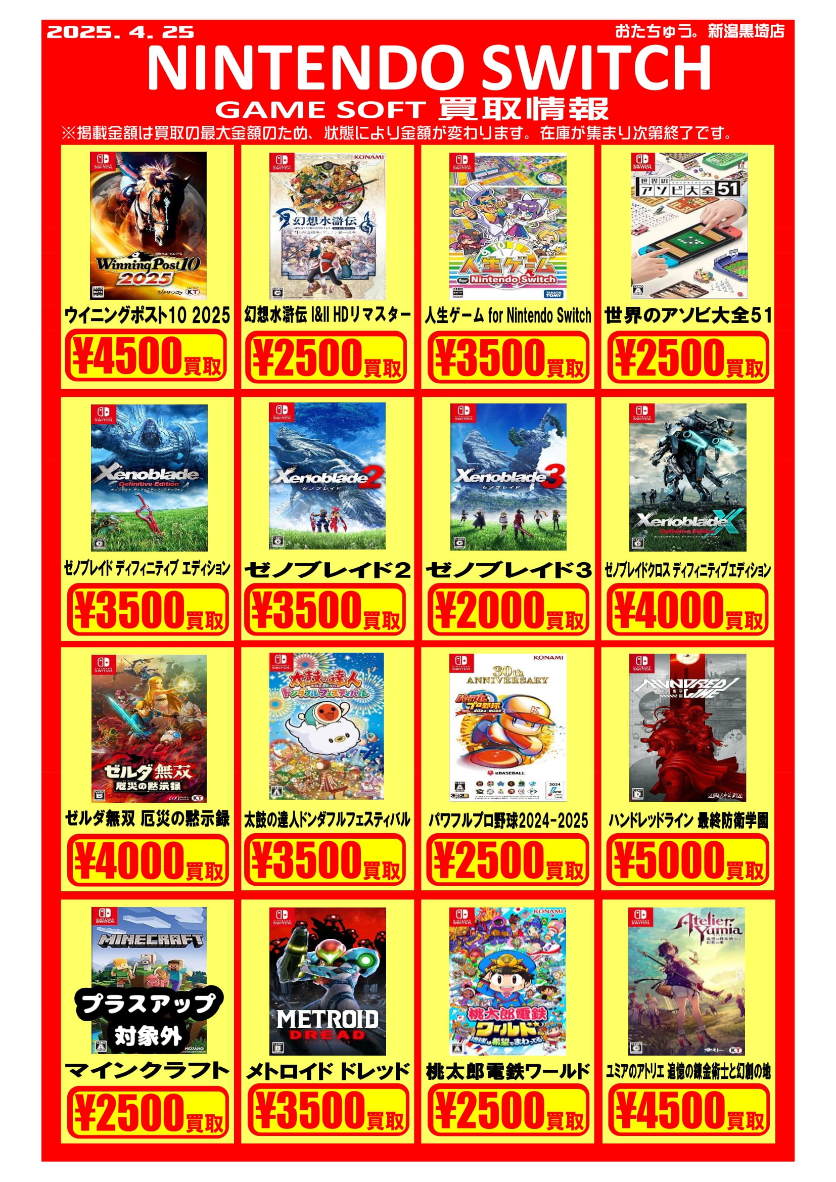 ✨ゲームソフト買取チラシを更新しました✨ 2025年4月25日ゲームソフトの買取チラシを更新いたしました! 遊び終わったソフトはぜひおたちゅう新潟黒埼店にお売りください✨ お待ちしております😊 ※2025/4/25現在の価格となります。在庫状況・状態によってお値段が変動いたします。予めご了承ください。****************こちら↓もぜひチェックしてみてくださいね♪(*´▽`*)・最新のイベント情報はこちら・最新の買取情報はこちら