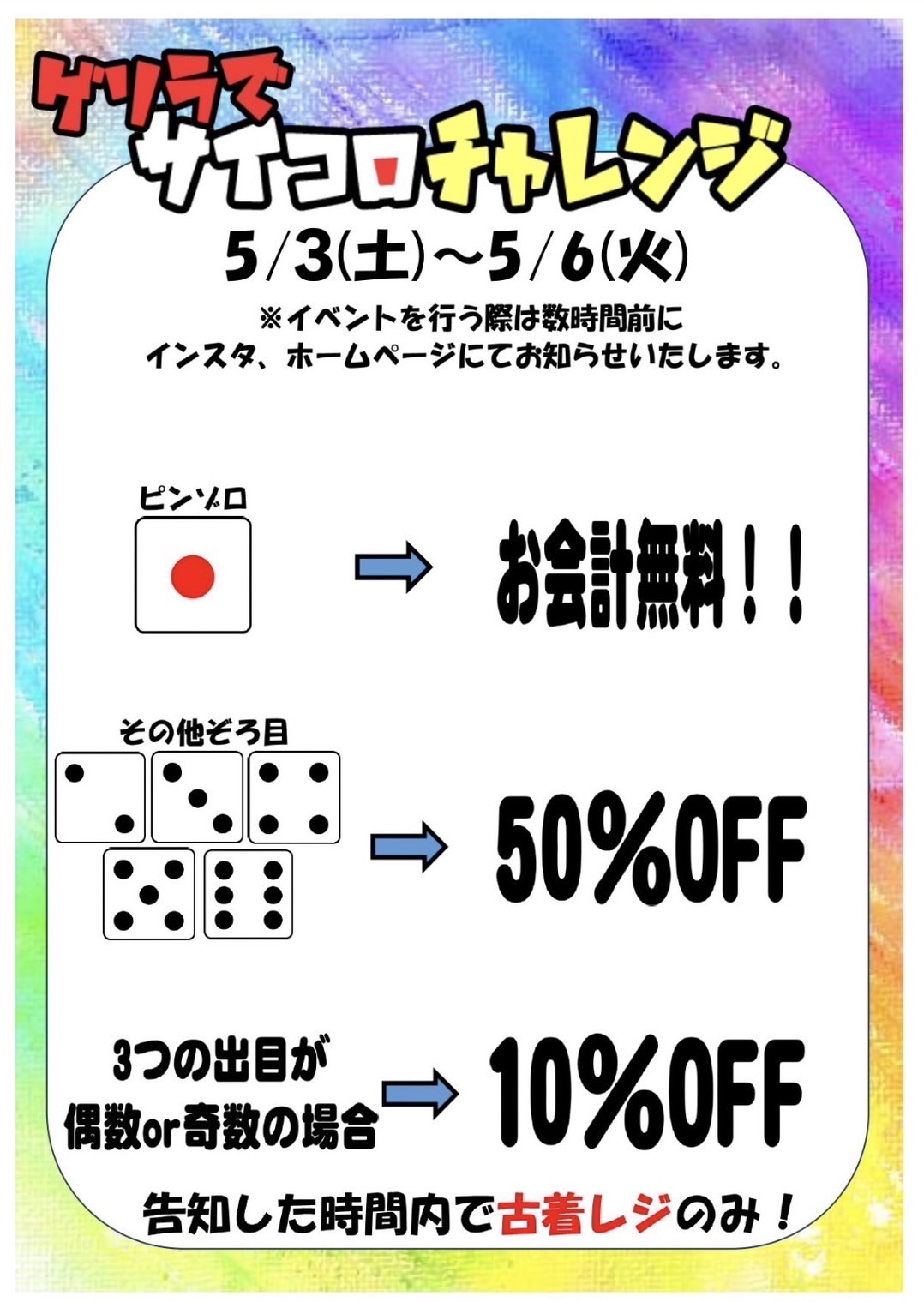 本日15~19時の間古着カウンターにてサイコロチャレンジが開催されます‼️‼️