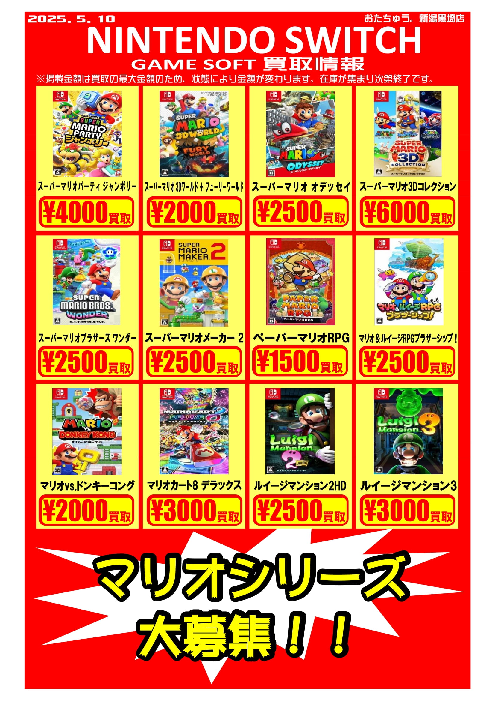 ✨ゲームソフト買取チラシを更新しました✨ 2025年5月9日ゲームソフトの買取チラシを更新いたしました!🎮🎮 遊び終わったソフトはぜひおたちゅう新潟黒埼店にお売りください✨ お待ちしております😊 ※2025/5/9現在の価格となります。在庫状況・状態によってお値段が変動いたします。予めご了承ください。****************こちら↓もぜひチェックしてみてくださいね♪(*´▽`*)・最新のイベント情報はこちら・最新の買取情報はこちら
