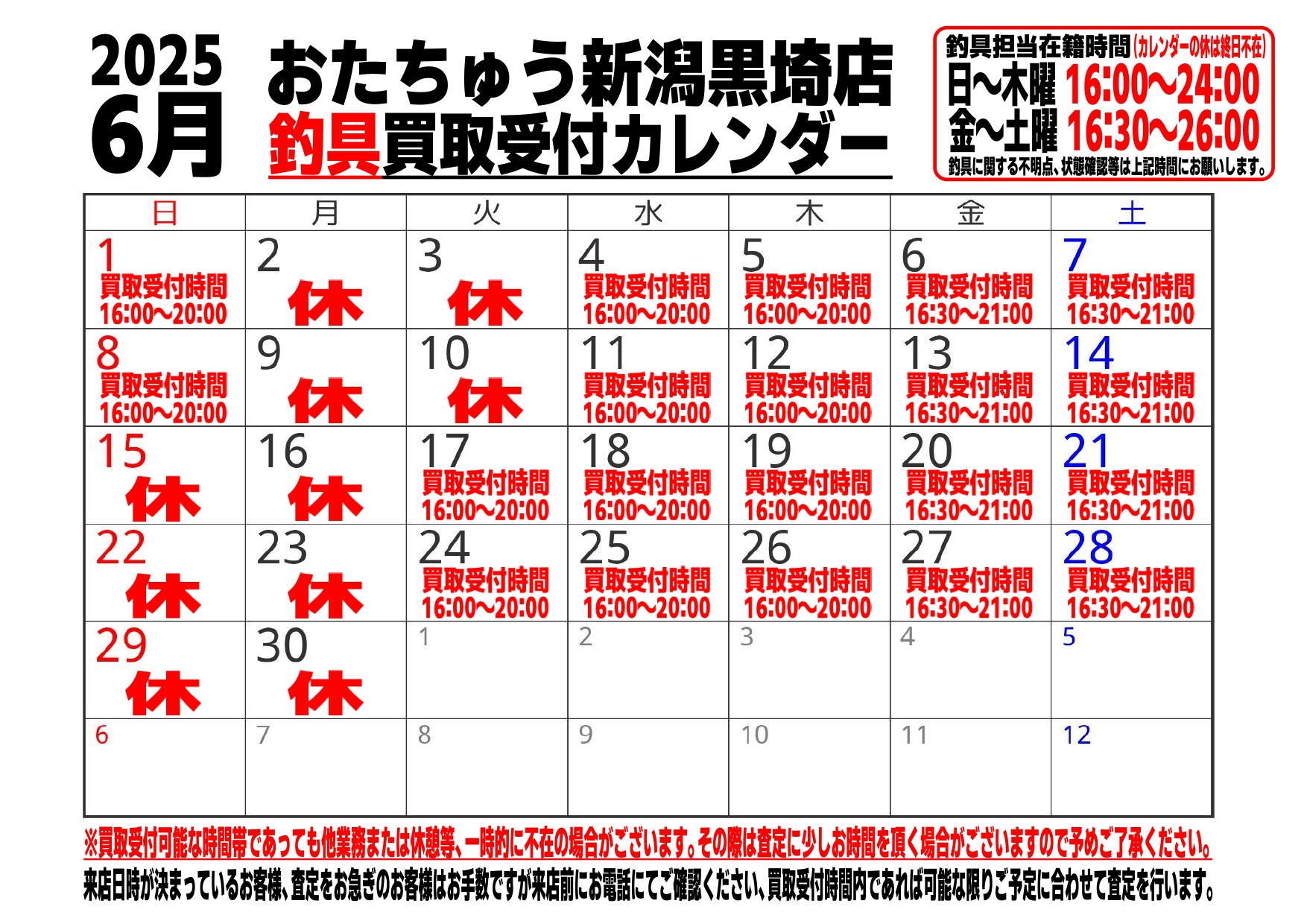 釣具6月買取カレンダー更新です🗓 2025年5月29日 2025年6月11日6月釣具買取カレンダー更新しました🗓 前半いつもと若干違いますのでご注意ください⚠️5/31土は16:30~21:00の買取となります。また、買取時間中であっても他業務等で一時的に不在の場合がございますので予めご了承ください🙇♂️ 来店日時がお決まりのお客様やお急ぎのお客様におきましては、お電話等ご連絡を頂ければカレンダー買取時間内にて可能な限りご予定に合わせて査定させて頂きます‼️