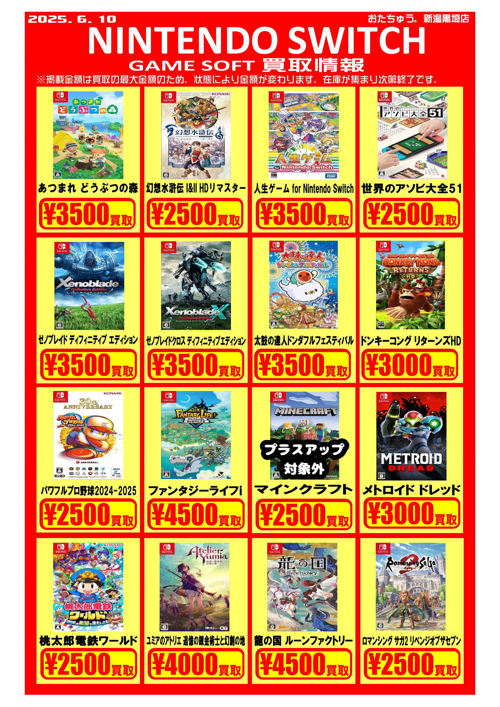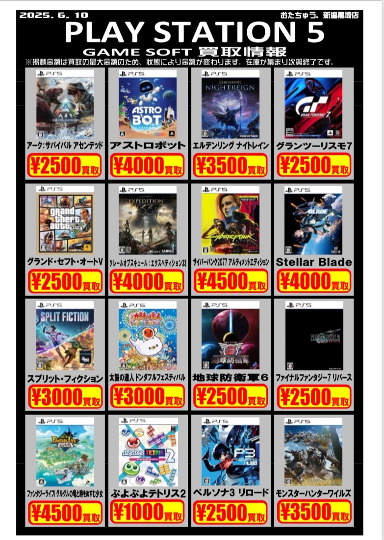 ✨ゲームソフト買取チラシを更新しました✨ 2025年6月10日ゲームソフトの買取チラシを更新いたしました!遊び終わったソフトはぜひおたちゅう新潟黒埼店にお売りください✨ お待ちしております😊 ※2025/6/10現在の価格となります。在庫状況・状態によってお値段が変動いたします。予めご了承ください。****************こちら↓もぜひチェックしてみてくださいね♪(*´▽`*)・最新のイベント情報はこちら・最新の買取情報はこちら
