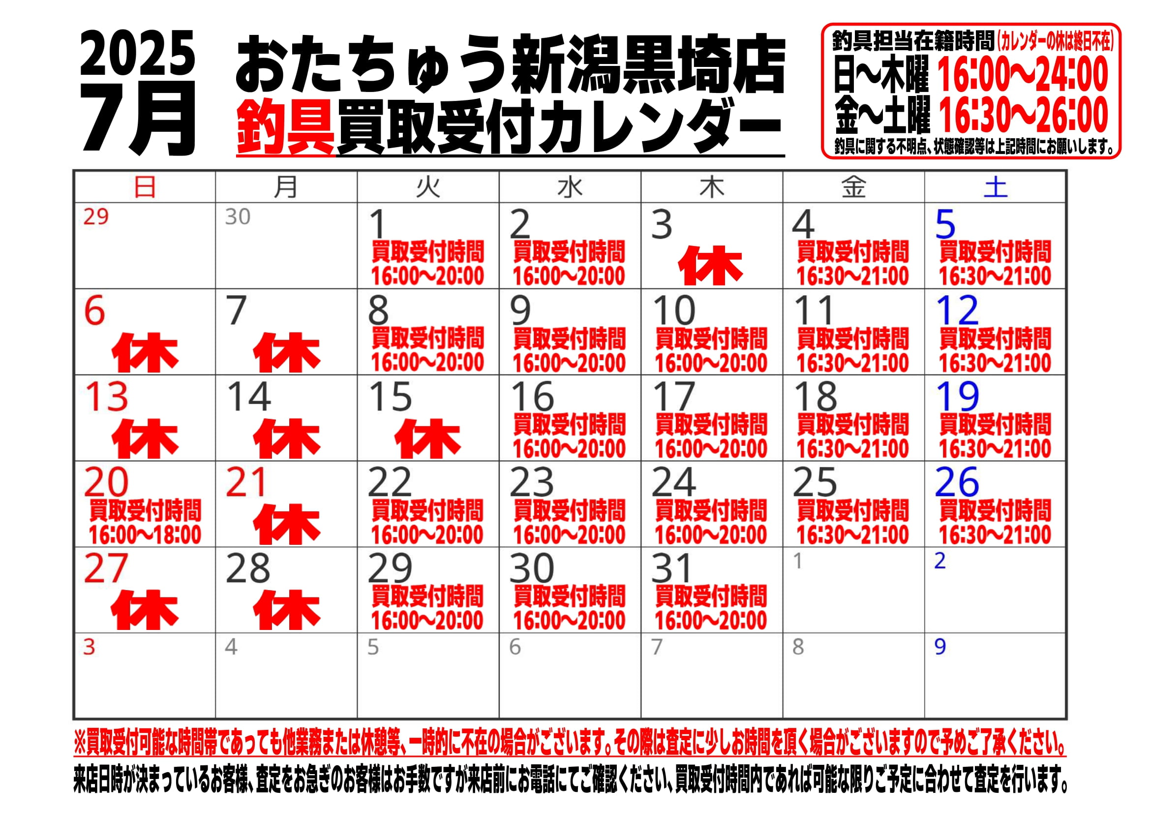 釣具7月買取カレンダー🗓 2025年7月1日 2025年7月31日 7月の釣具買取カレンダーとなります💡 若干いつもとお休みが違う日にちがありますのでご注意ください⚠️それではたくさんの買取お持ち込みお待ちしております💪 また、買取時間中であっても他業務等で一時的に不在の場合がございますので予めご了承ください💦 来店日時がお決まりのお客様におきましては、お電話等ご連絡を頂ければカレンダー買取時間内にて可能な限りご予定に合わせて査定させて頂きます‼️※変更があった場合には更新する場合がございますのでご了承ください。
