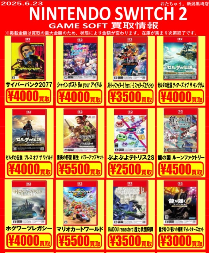 スイッチ2ソフトの買取チラシ 2025年6月23日スイッチ2ソフトの買取チラシを更新しました! ※スレ、キズ、痛み、在庫多数、その他の事情で予告なく金額が変わる場合がございます。皆さまのご来店お待ちしてます! ※2025/6/23現在の価格となります。在庫状況・状態によってお値段が変動いたします。予めご了承ください。****************こちら↓もぜひチェックしてみてくださいね♪(*´▽`*)・最新のイベント情報はこちら・最新の買取情報はこちら