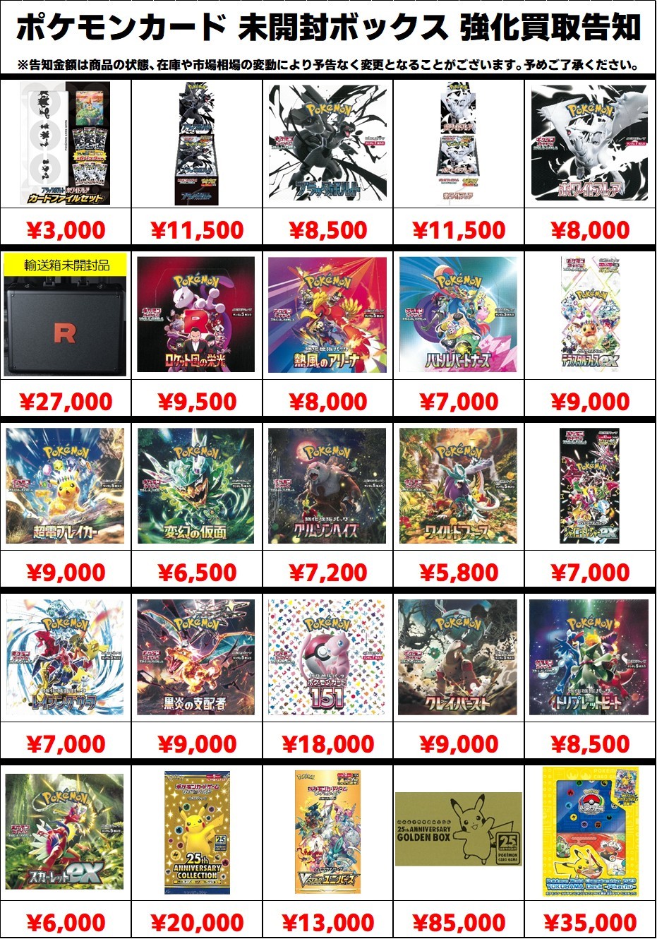 ★BOX強化買取‼️★ 2025年7月7日ポケモンカードBOX強化買取中です‼️ 各種在庫が集まり次第調整いたしますのでお早めにお持ちください😄 注意:商品輸送中の箱ダメージ、潰れはダメージ判定となり減額対象になります。 お買い上げシールがついてるものも減額対象になります。 ※2025/7/7現在の価格となります。在庫状況・状態によってお値段が変動いたします。予めご了承ください。****************こちら↓もぜひチェックしてみてくださいね♪(*´▽`*)・最新のイベント情報はこちら・最新の買取情報はこちら