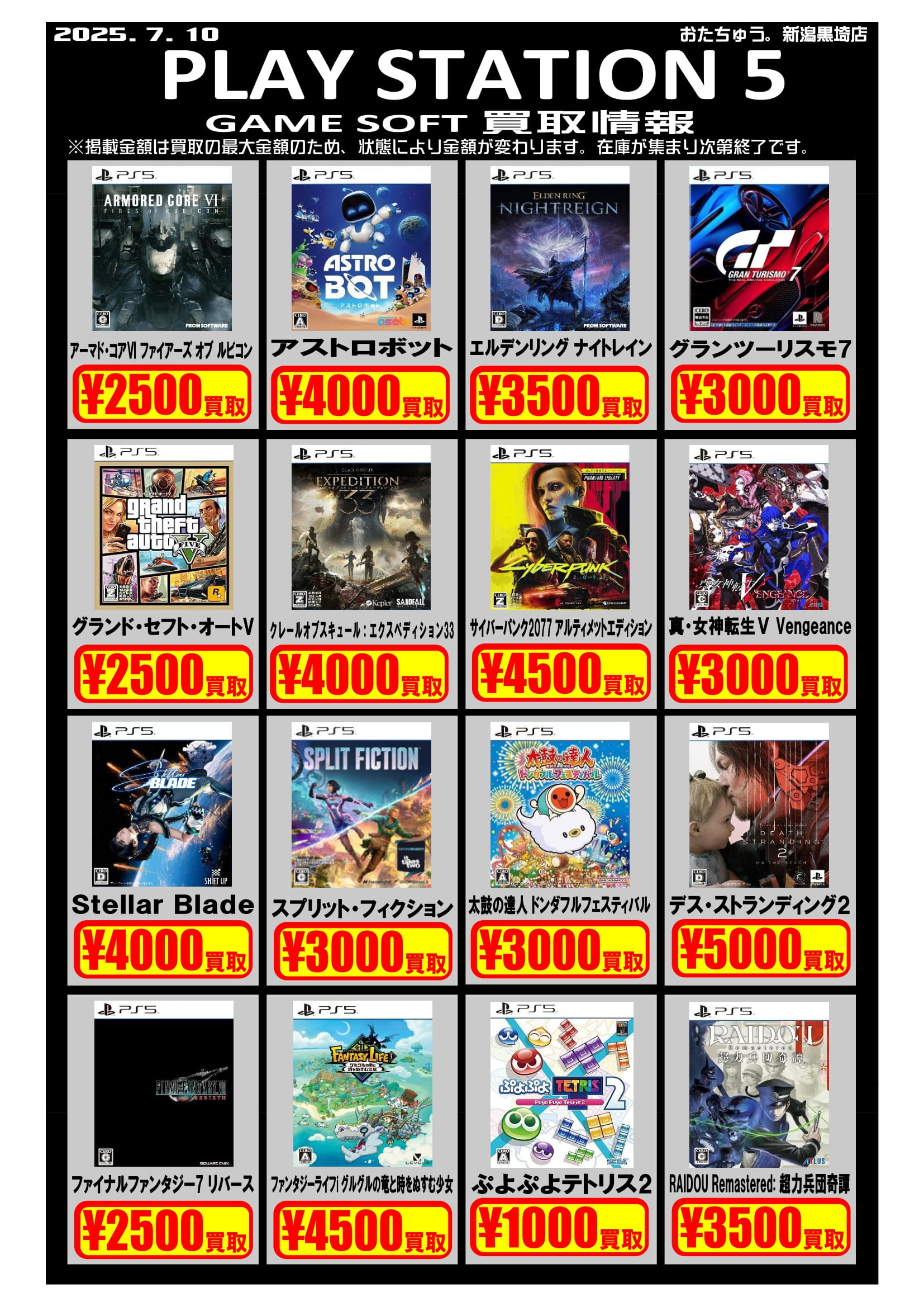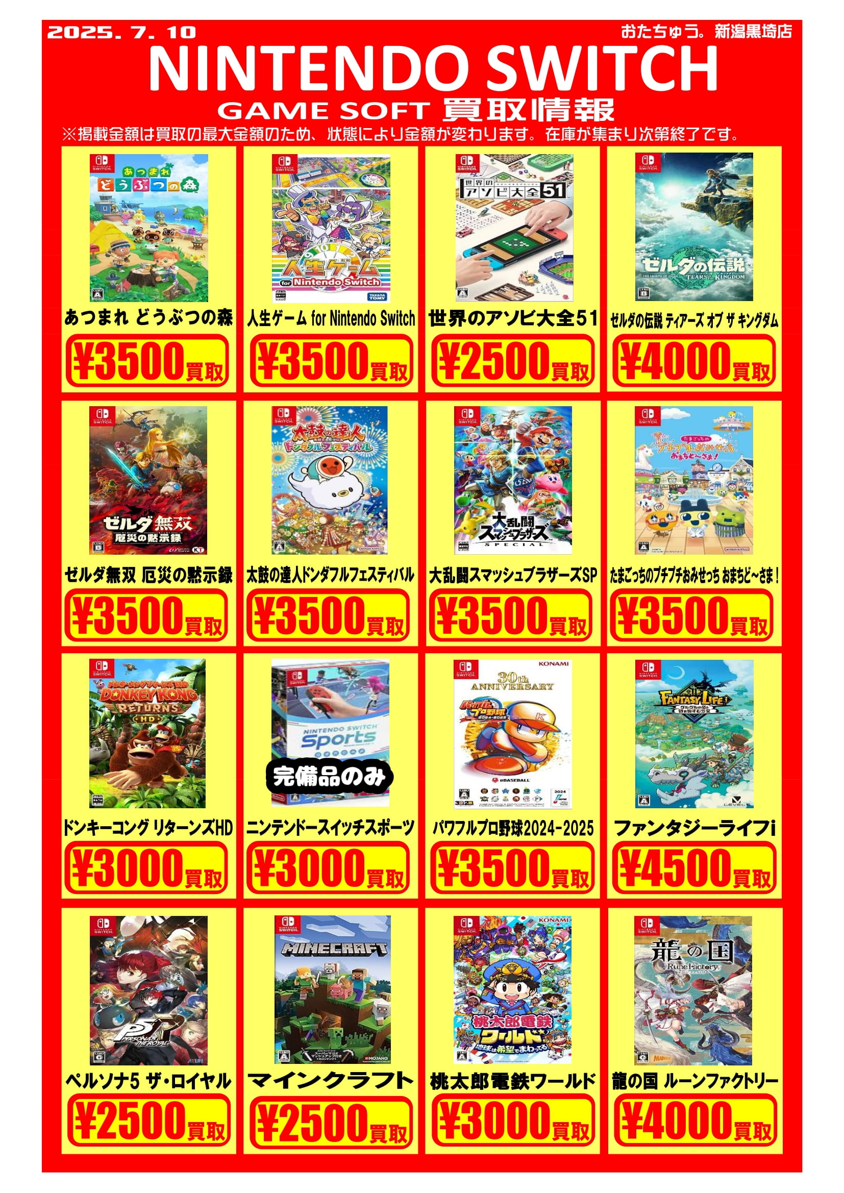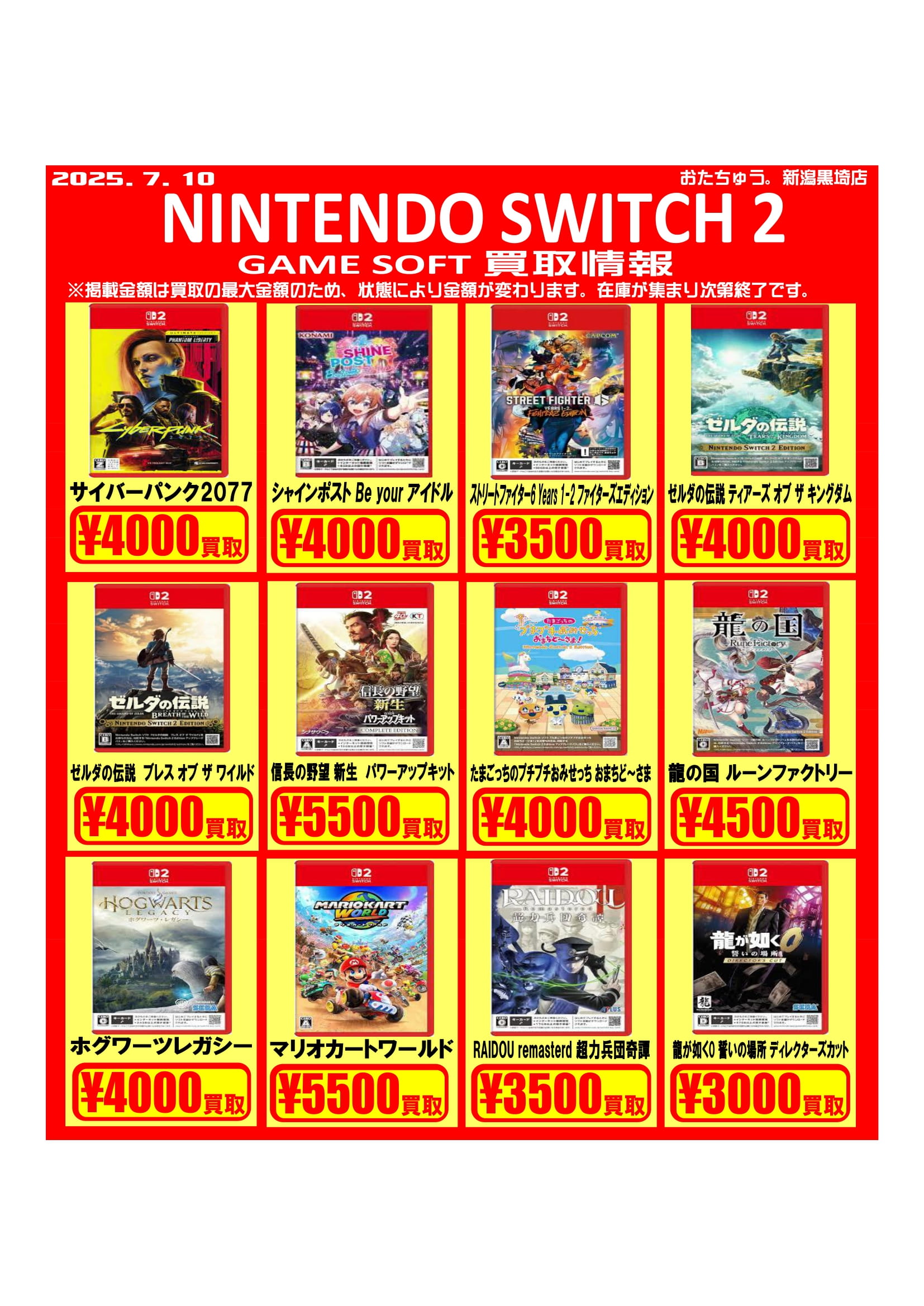 ✨ゲームソフト買取チラシを更新しました✨ 2025年7月10日ゲームソフトの買取チラシを更新いたしました! 遊び終わったソフトはぜひおたちゅう新潟黒埼店にお売りください✨ お待ちしております😊 ※2025/7/10現在の価格となります。在庫状況・状態によってお値段が変動いたします。予めご了承ください。****************こちら↓もぜひチェックしてみてくださいね♪(*´▽`*)・最新のイベント情報はこちら・最新の買取情報はこちら