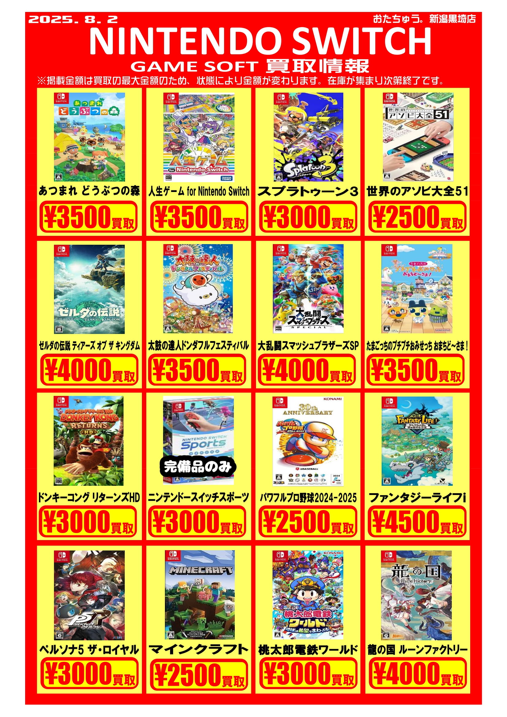 ✨ゲームソフト買取チラシを更新しました✨ 2025年8月2日ゲームソフトの買取チラシを更新いたしました!遊び終わったソフトはぜひおたちゅう新潟黒埼店にお売りください✨ お待ちしております😊 ※2025/8/2現在の価格となります。在庫状況・状態によってお値段が変動いたします。予めご了承ください。****************こちら↓もぜひチェックしてみてくださいね♪(*´▽`*)・最新のイベント情報はこちら・最新の買取情報はこちら