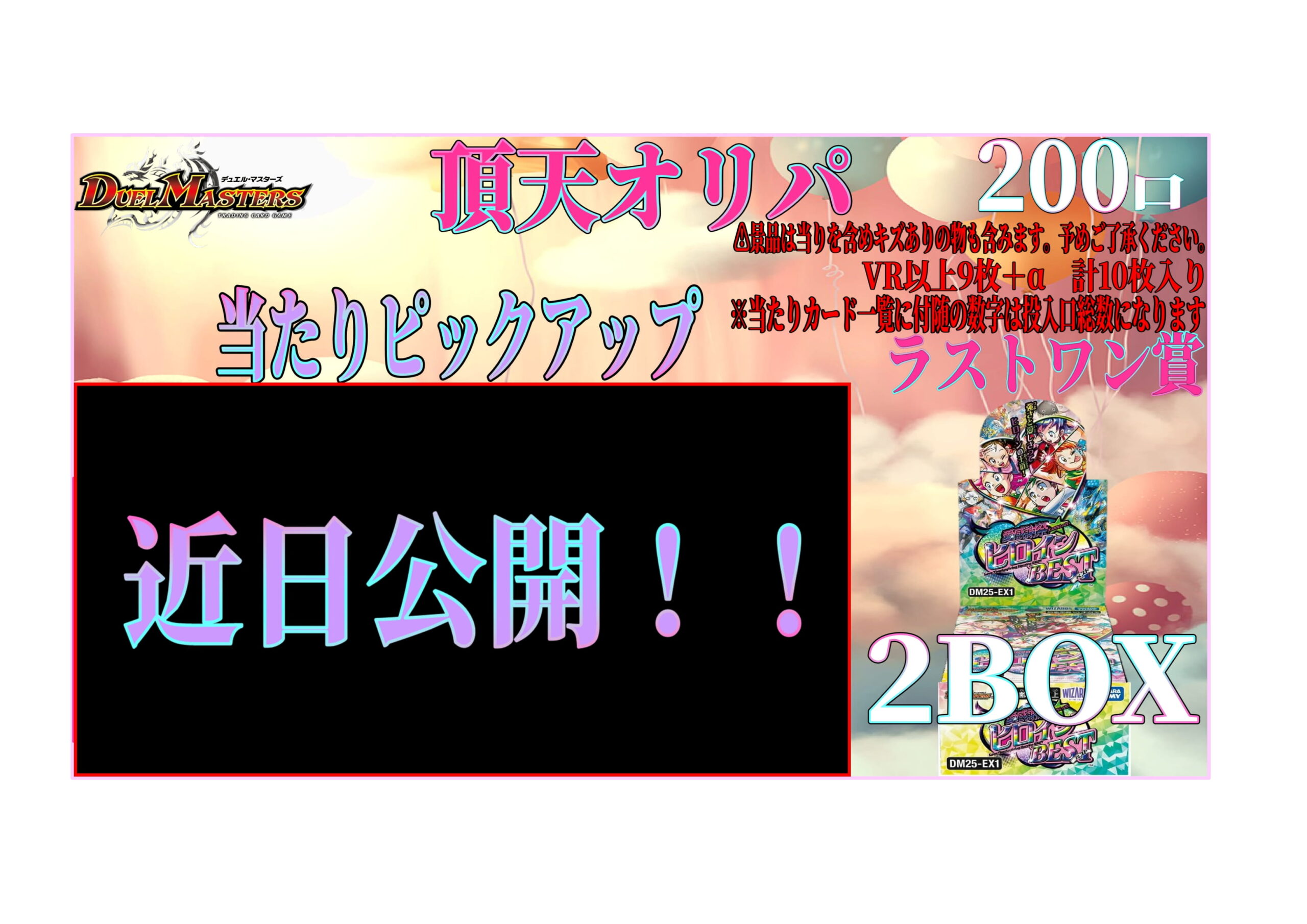 今年の夏もデュエマのオリパがやってくる! 2025年8月4日今年もやります!デュエマオリパ! 今回は全200口の1口1000円! ラストワンにはヒロインBESTが2BOX!!!(´。✪ω✪。 ` ) 当たりピックアップは8月8日19時に店舗オリパ販売ショーケースにて公開します! 販売は8月9日朝9時スタート! 皆さんの挑戦お待ちしております! ****************こちら↓もぜひチェックしてみてくださいね♪(*´▽`*)・最新のイベント情報はこちら・最新の買取情報はこちら