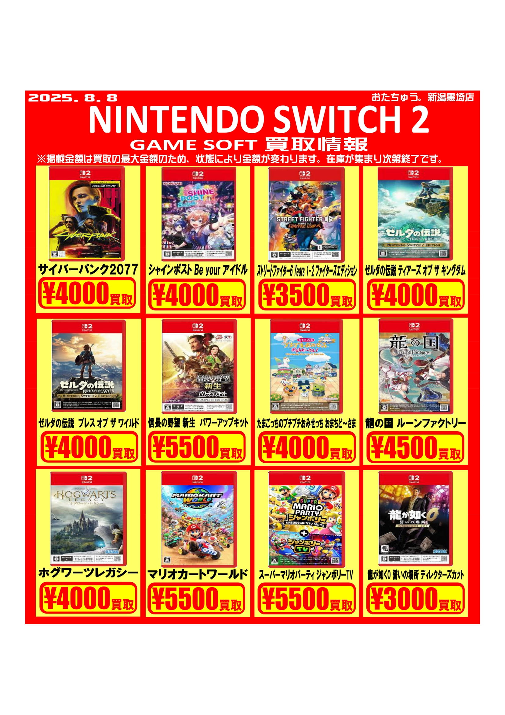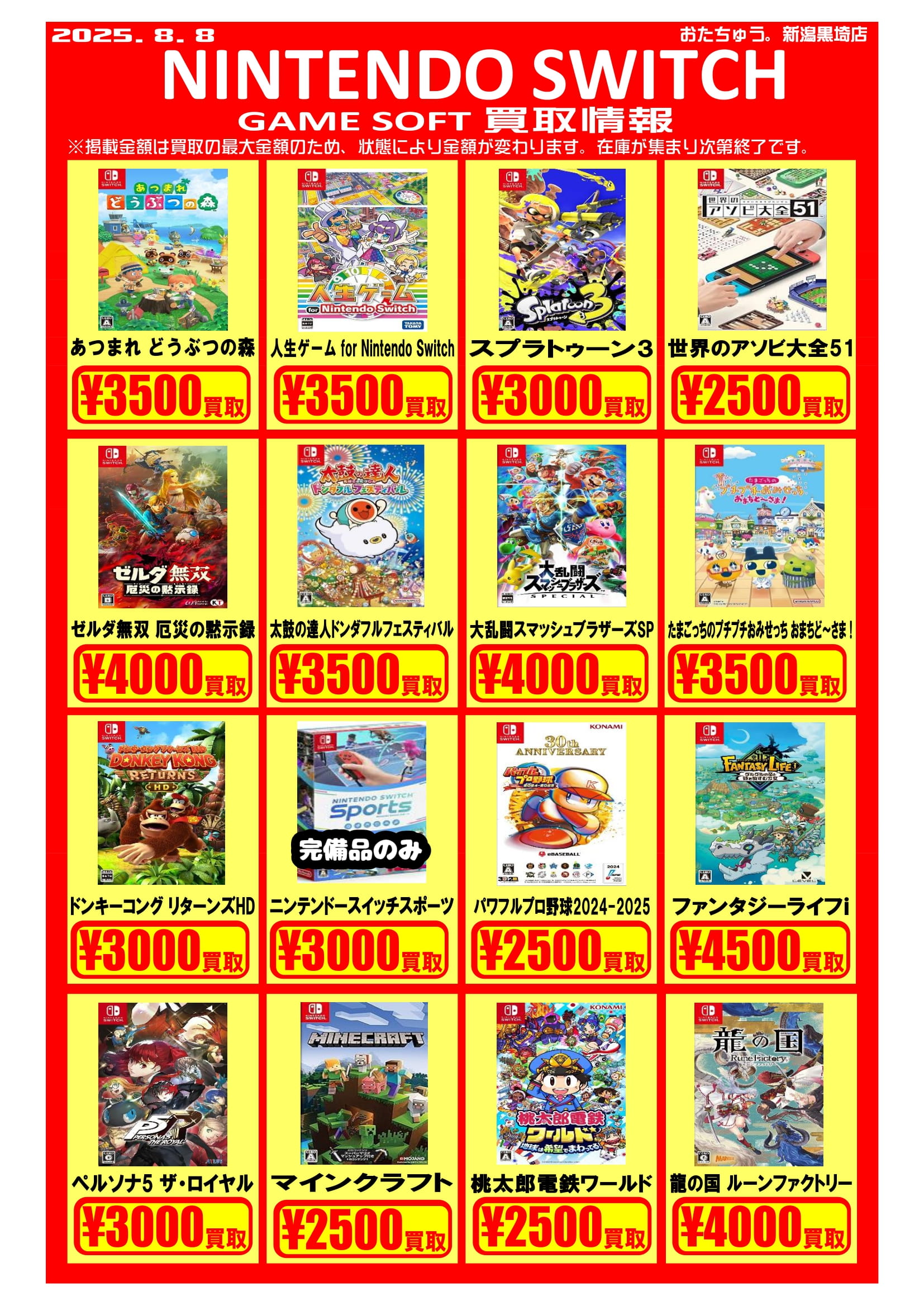 ✨ゲームソフト買取チラシを更新しました✨ 2025年8月8日ゲームソフトの買取チラシを更新いたしました!遊び終わったソフトはぜひおたちゅう新潟黒埼店にお売りください✨ お待ちしております😊 ※2025/8/8現在の価格となります。在庫状況・状態によってお値段が変動いたします。予めご了承ください。****************こちら↓もぜひチェックしてみてくださいね♪(*´▽`*)・最新のイベント情報はこちら・最新の買取情報はこちら