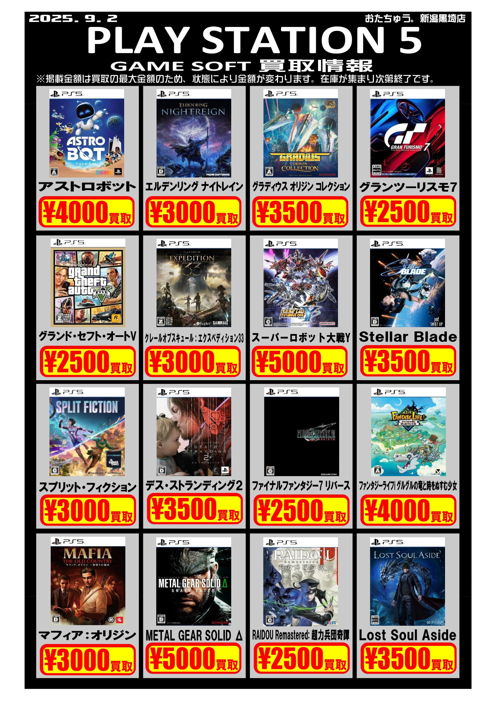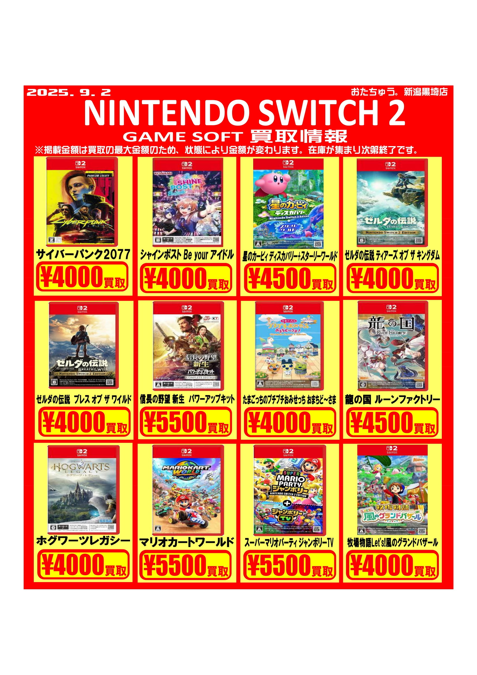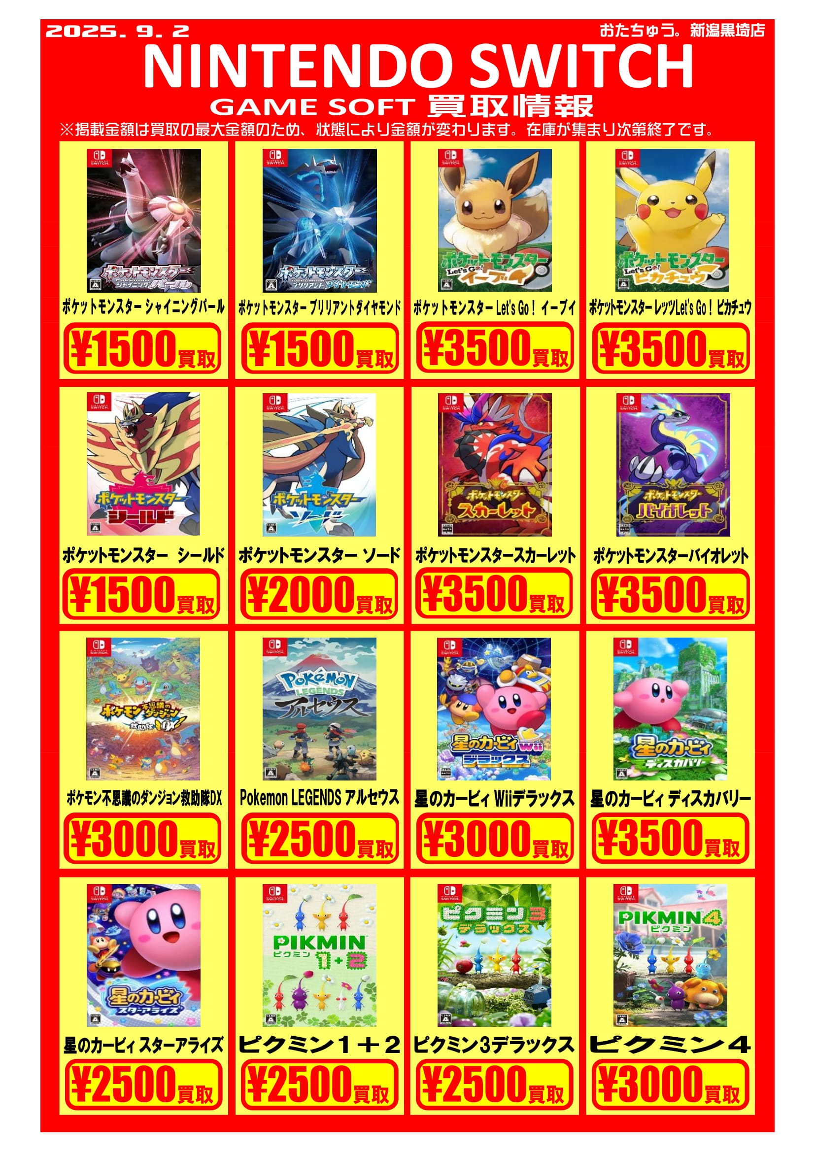 ✨ゲームソフト買取チラシを更新しました✨ 2025年9月1日ゲームソフトの買取チラシを更新いたしました!遊び終わったソフトはぜひおたちゅう新潟黒埼店にお売りください✨ お待ちしております😊 ※2025/9/1現在の価格となります。在庫状況・状態によってお値段が変動いたします。予めご了承ください。****************こちら↓もぜひチェックしてみてくださいね♪(*´▽`*)・最新のイベント情報はこちら・最新の買取情報はこちら
