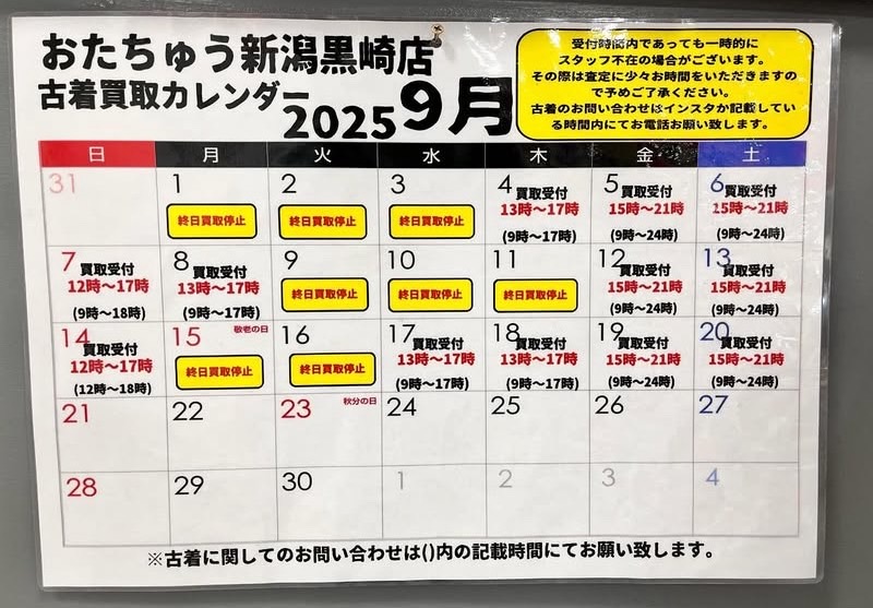 9月20日までの古着買取カレンダーとなります🗓