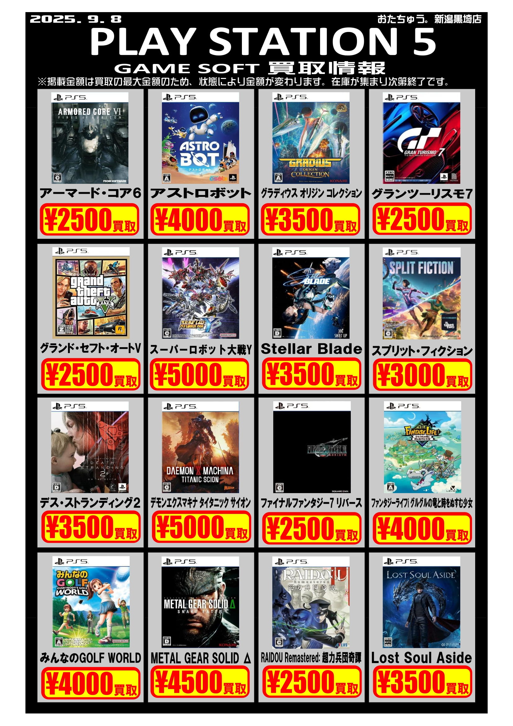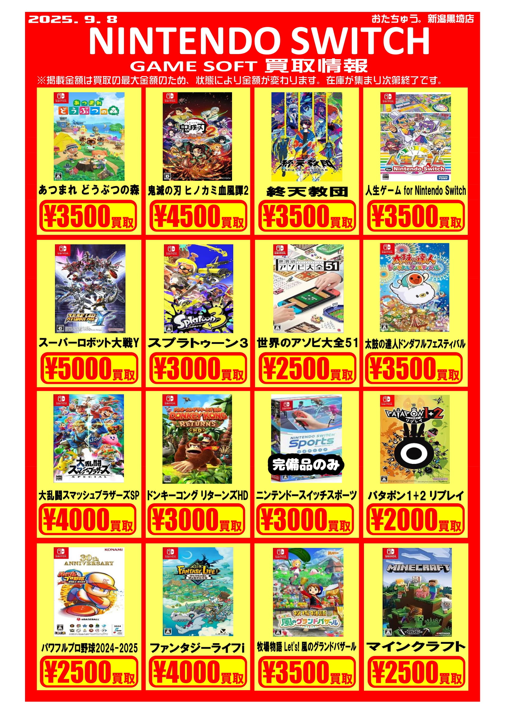 ✨ゲームソフト買取チラシを更新しました✨ 2025年9月8日ゲームソフトの買取チラシを更新いたしました!遊び終わったソフトはぜひおたちゅう新潟黒埼店にお売りください✨ お待ちしております😊 ※2025/9/8現在の価格となります。在庫状況・状態によってお値段が変動いたします。予めご了承ください。****************こちら↓もぜひチェックしてみてくださいね♪(*´▽`*)・最新のイベント情報はこちら・最新の買取情報はこちら