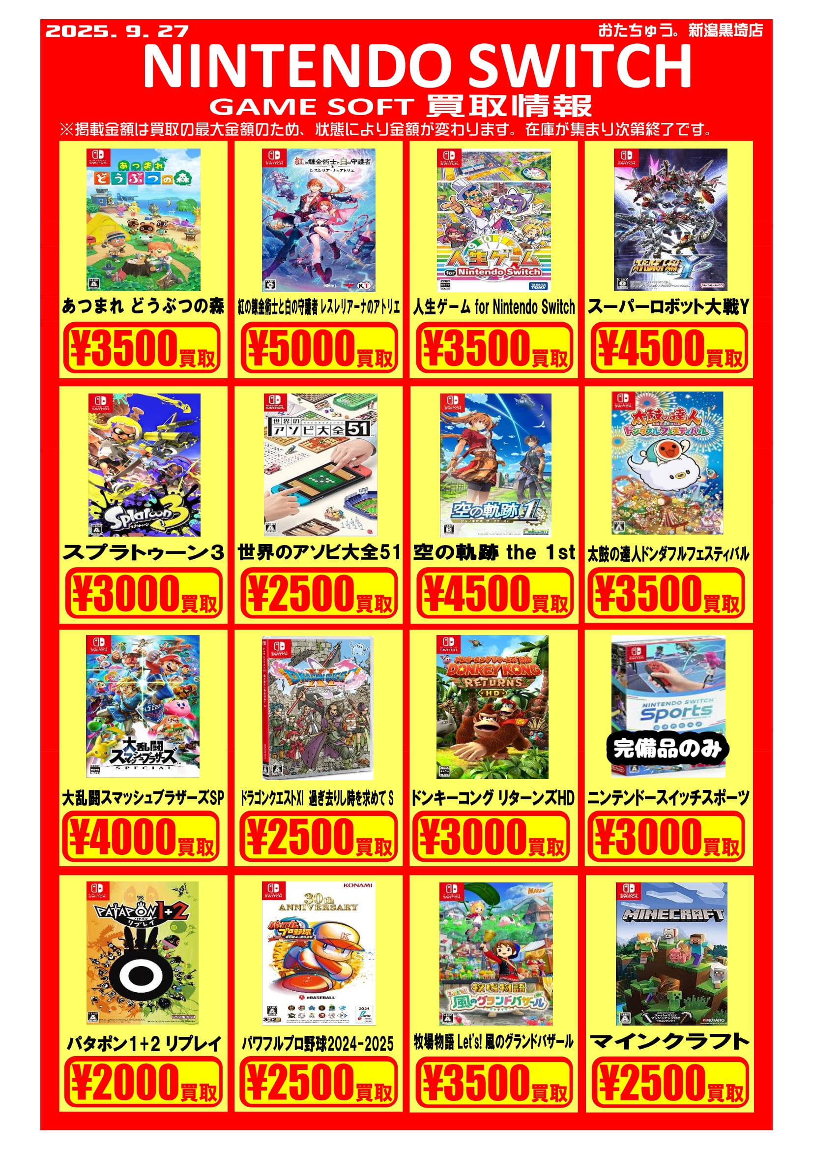 ✨ゲームソフト買取チラシを更新しました✨ 2025年9月27日ゲームソフトの買取チラシを更新いたしました!遊び終わったソフトはぜひおたちゅう新潟黒埼店にお売りください✨ お待ちしております😊 ※2025/9/27現在の価格となります。在庫状況・状態によってお値段が変動いたします。予めご了承ください。****************こちら↓もぜひチェックしてみてくださいね♪(*´▽`*)・最新のイベント情報はこちら・最新の買取情報はこちら