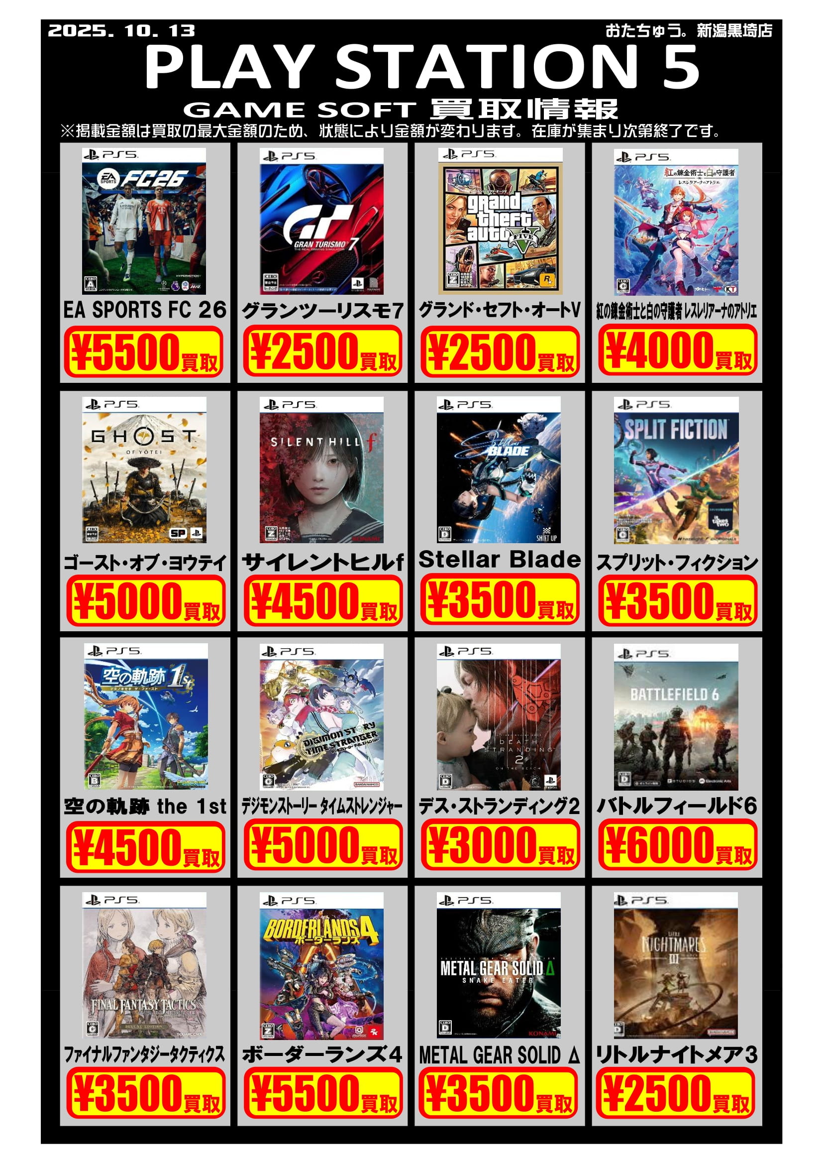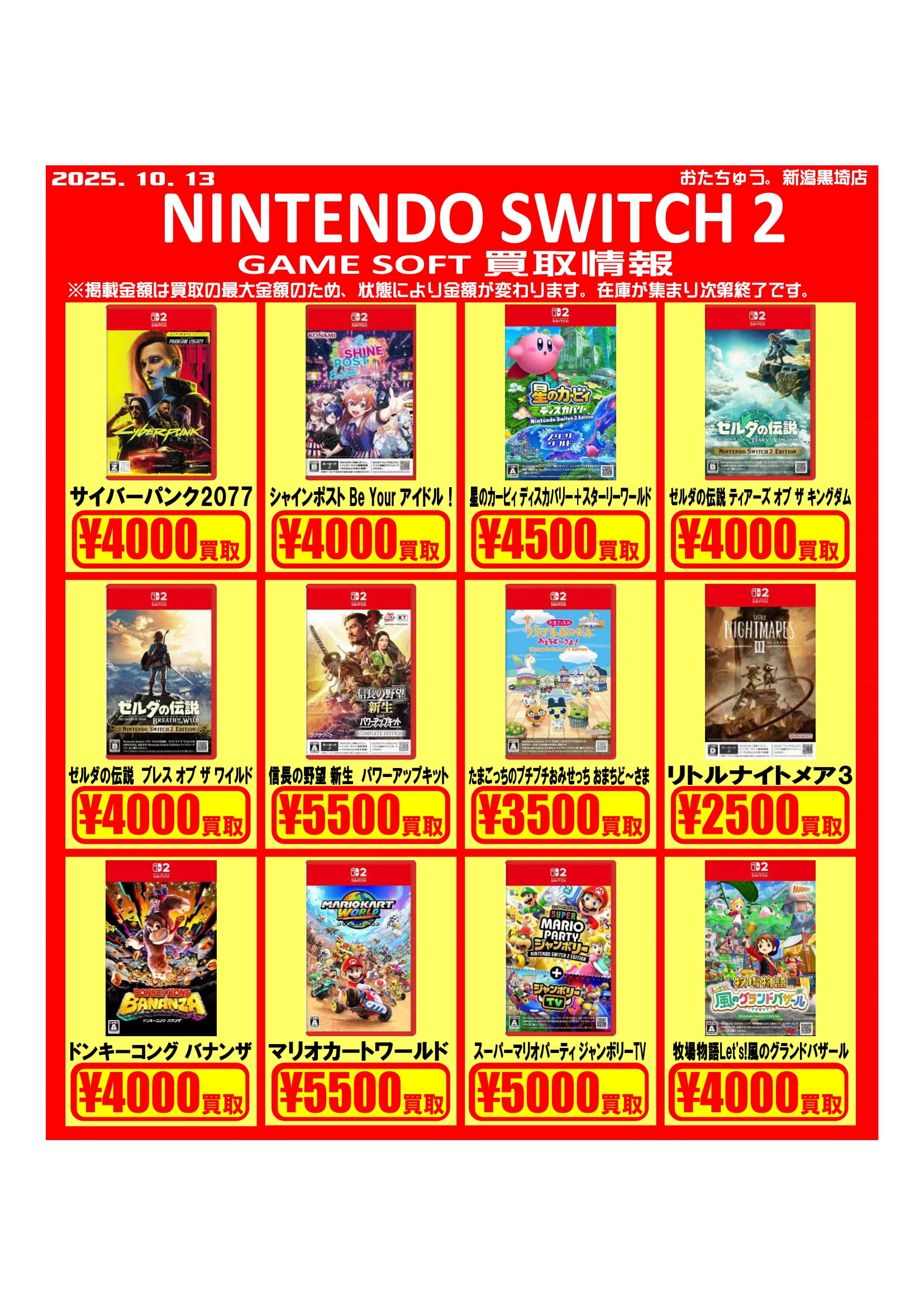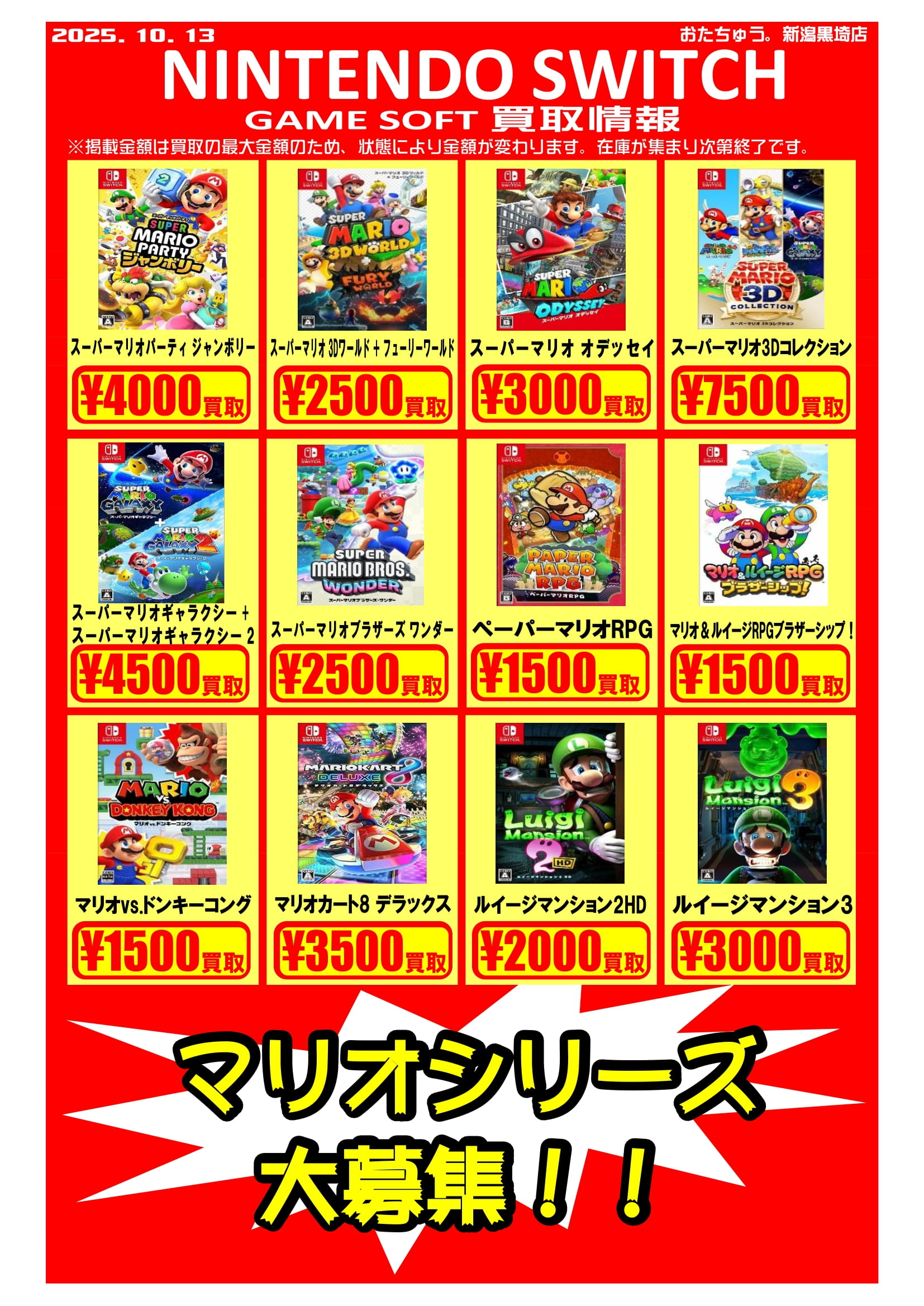 ✨ゲームソフト買取チラシを更新しました✨ 2025年10月13日ゲームソフトの買取チラシを更新いたしました! 遊び終わったソフトはぜひおたちゅう新潟黒埼店にお売りください✨ お待ちしております😊※2025/10/13 現在の価格となります。在庫状況・状態によってお値段が変動いたします。予めご了承ください。****************こちら↓もぜひチェックしてみてくださいね♪(*´▽`*)・最新のイベント情報はこちら・最新の買取情報はこちら