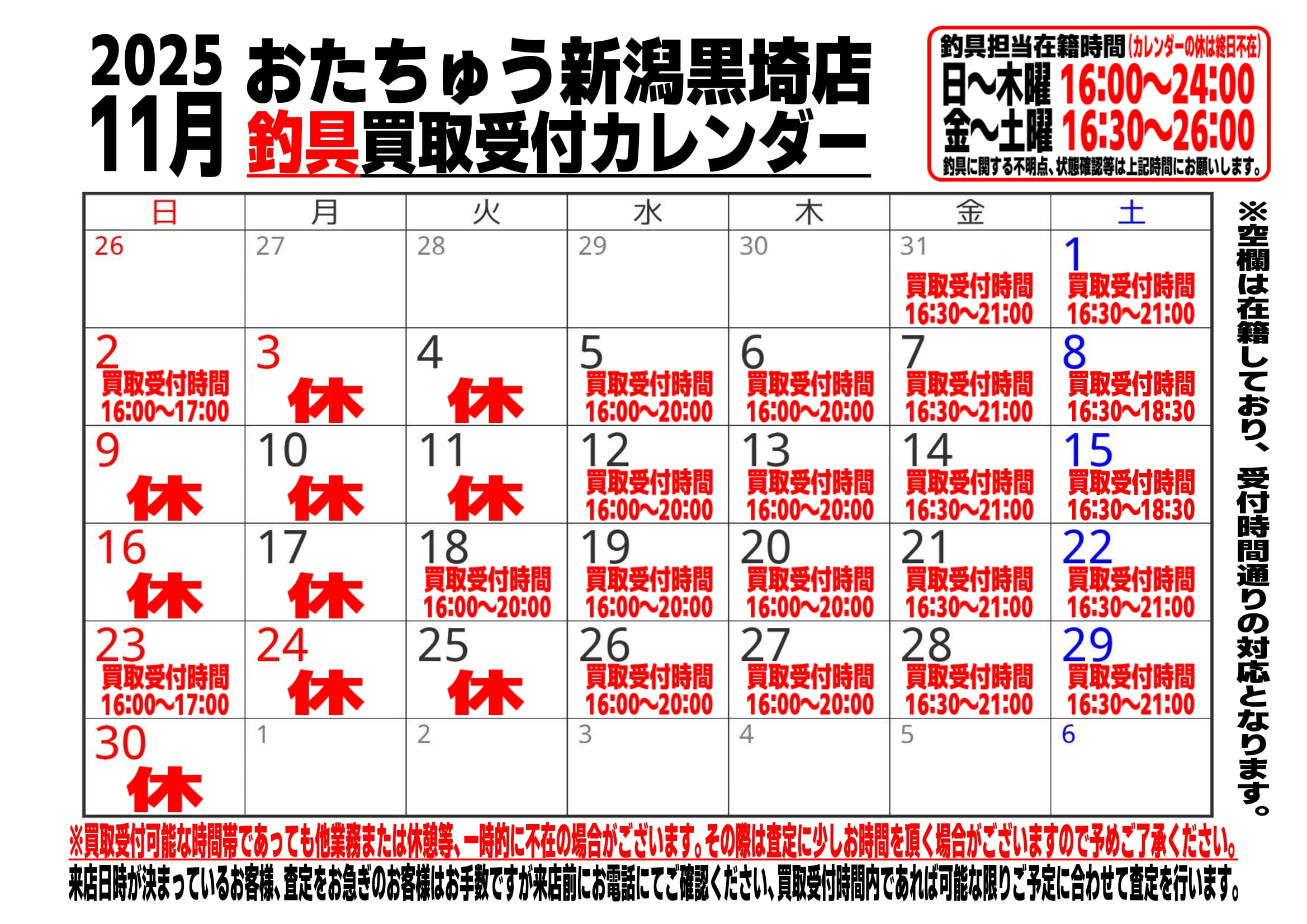 11/8(土)と11/15(土)の買取時間変更と11/11(火)は釣具買取休止となります。