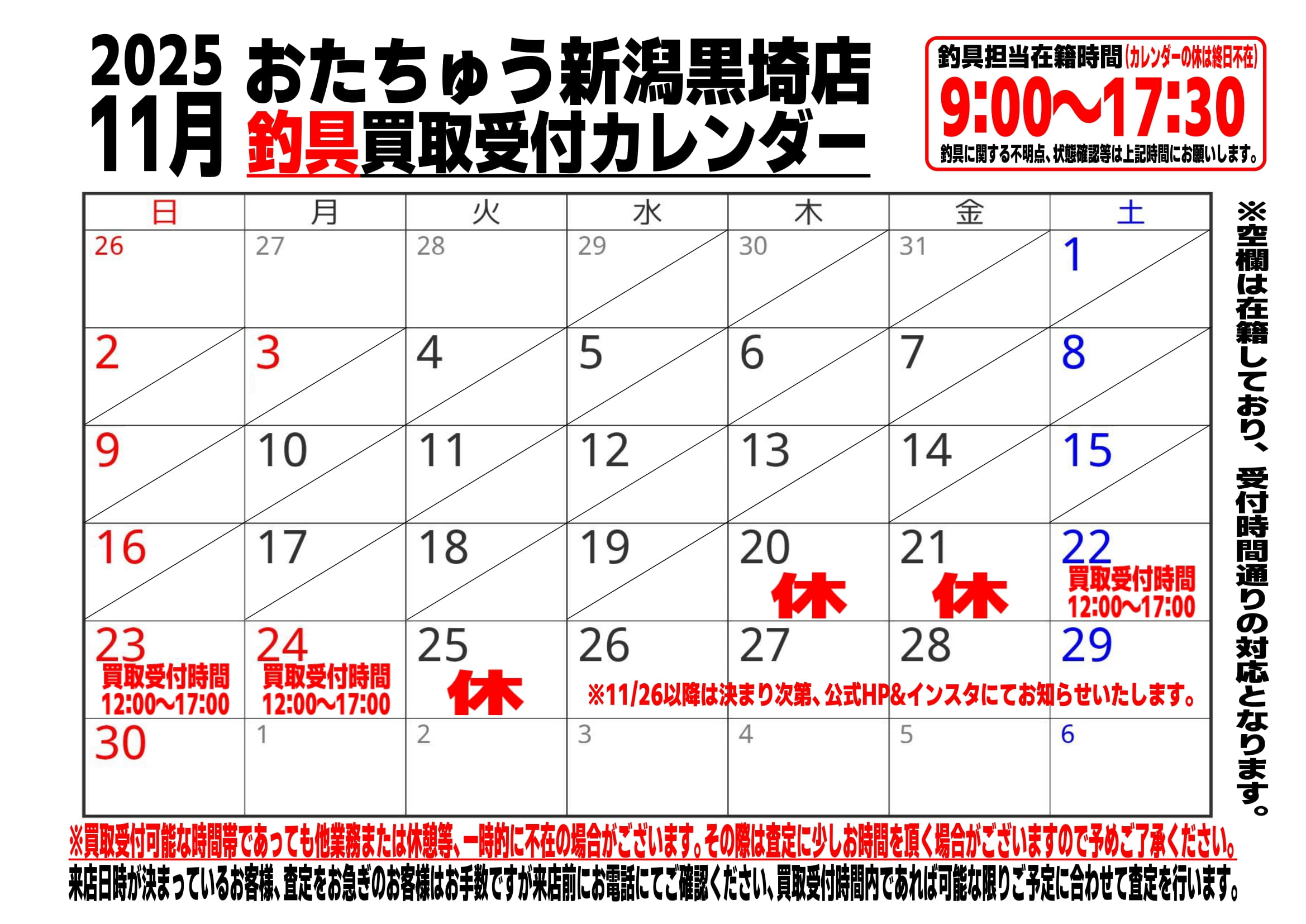 ■釣具11月買取カレンダー更新🗓■ 2025年11月21日 2025年12月1日 111/21〜より勤務時間変更に伴い、 釣具買取カレンダーを変更させて頂きました。🗓 11/26以降は決まり次第、公式HP及びインスタグラムにてお知らせ致します。 また、買取受付時間中であっても他業務等で一時的に不在の場合がございますので予めご了承ください💦 来店日時がお決まりのお客様におきましては、お電話等ご連絡を頂ければカレンダー買取時間内にて可能な限りご予定に合わせて査定させて頂きます‼️※変更があった場合には更新する場合がございますのでご了承ください。