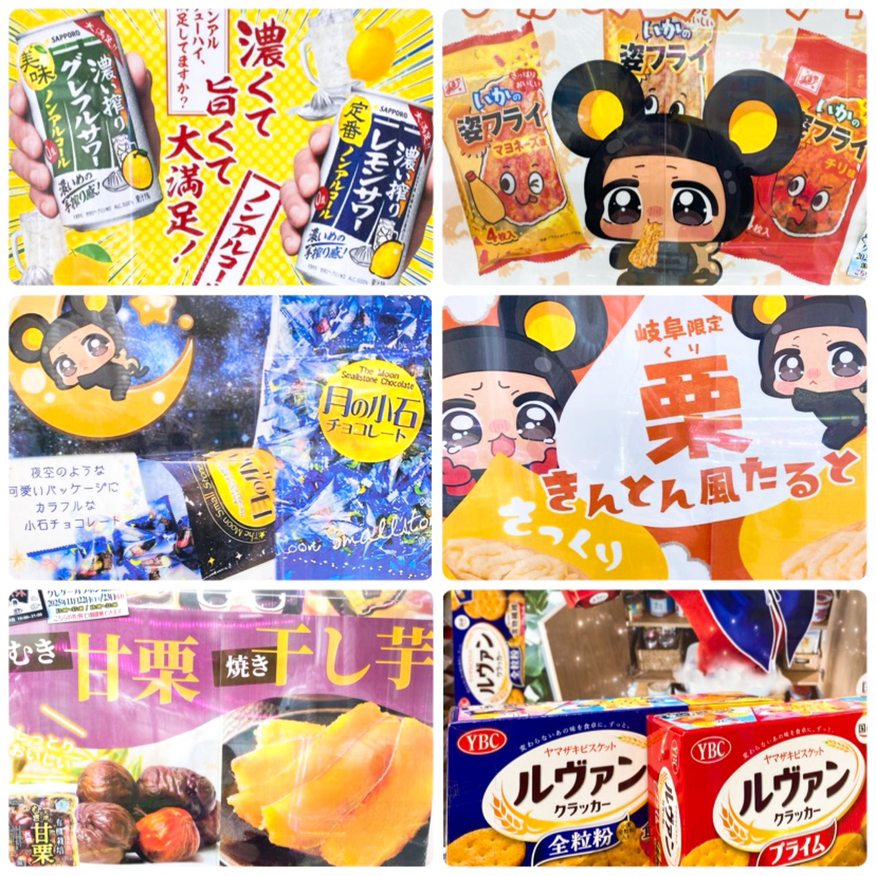 ■週末限定‼100円2プレイ‼️■ 2025年11月15日今週の6ブースは…🥁🥁🥁・ノンアルコール濃いしぼり2種(グレープフルーツ、レモン)🍋 ・4枚姿フライ3種(オリジナル、マヨネーズ、チリ)🦑 ・月の小石チョコレート🍫 ・栗きんとん風タルト🥧 ・むき甘栗&焼き干し芋🌰🍠 ・ルヴァンクラッカー🍪 是非この機会にじゃんじゃん取っておやつタイムを満喫してね❤️❤️❤️ 皆様のご来店と沢山のご挑戦を心よりお待ちしております☺️💕