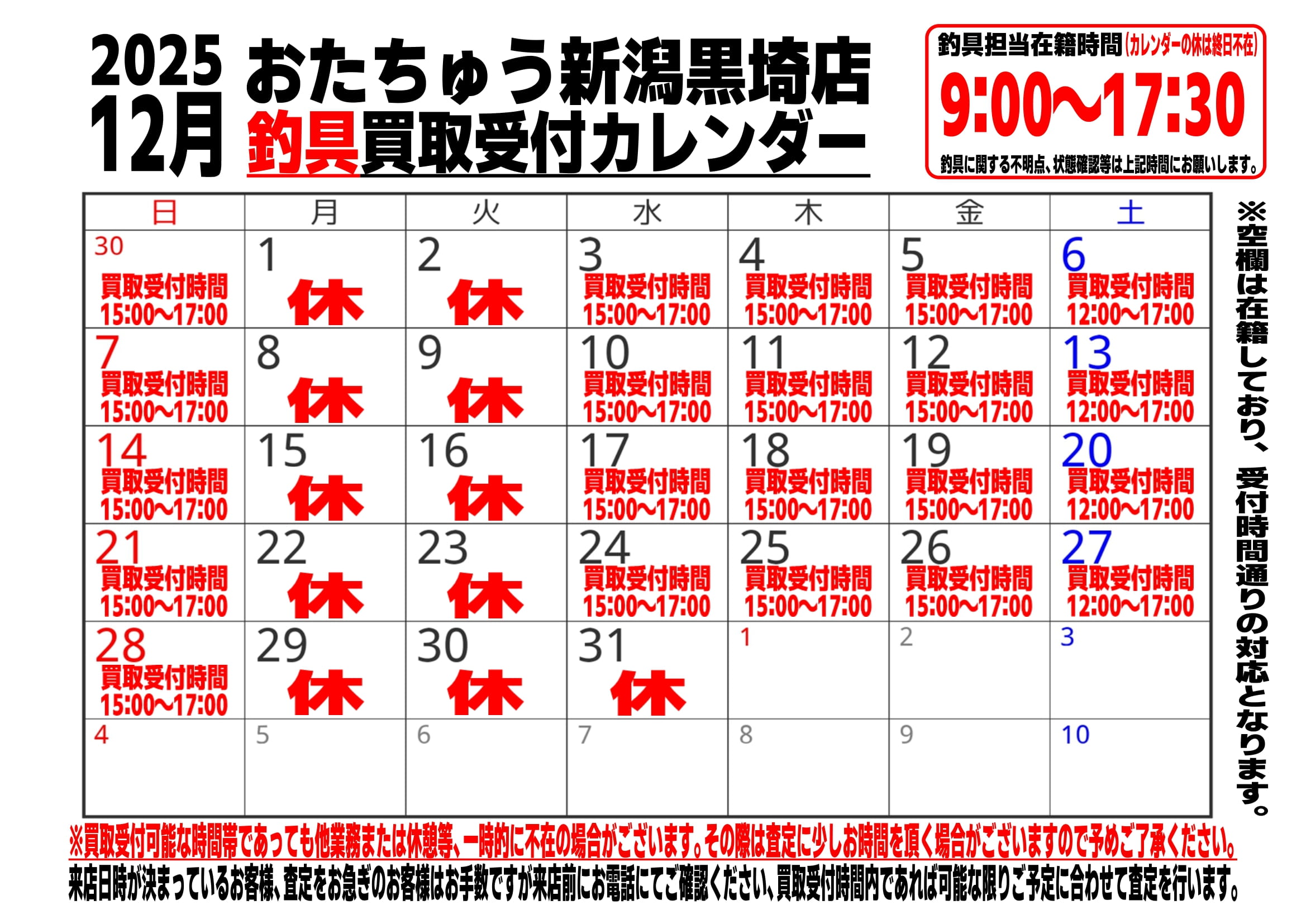 釣具12月買取カレンダー更新🗓 2025年12月4日更新遅くなり申し訳ありません🙇♂️ 12月釣具買取カレンダー更新しました🗓 また、在籍時間及び買取受付時間中であっても他業務等や休憩等で一時的に不在の場合がございますので予めご了承ください💦 お急ぎの方や来店日時がお決まりのお客様におきましては、お電話等ご連絡を頂ければカレンダー買取時間内にて可能な限りご予定に合わせて査定させて頂きます‼️※変更があった場合には更新する場合がございますのでご了承ください。