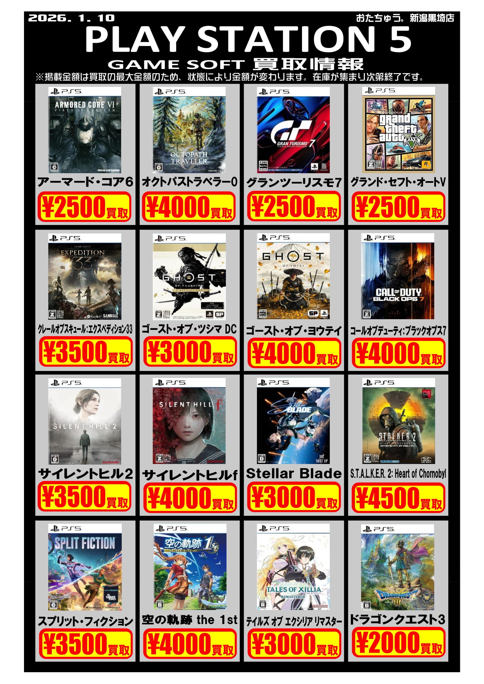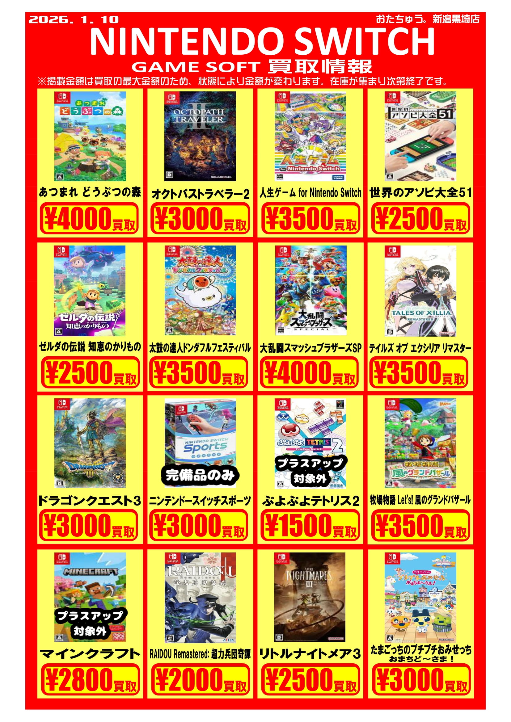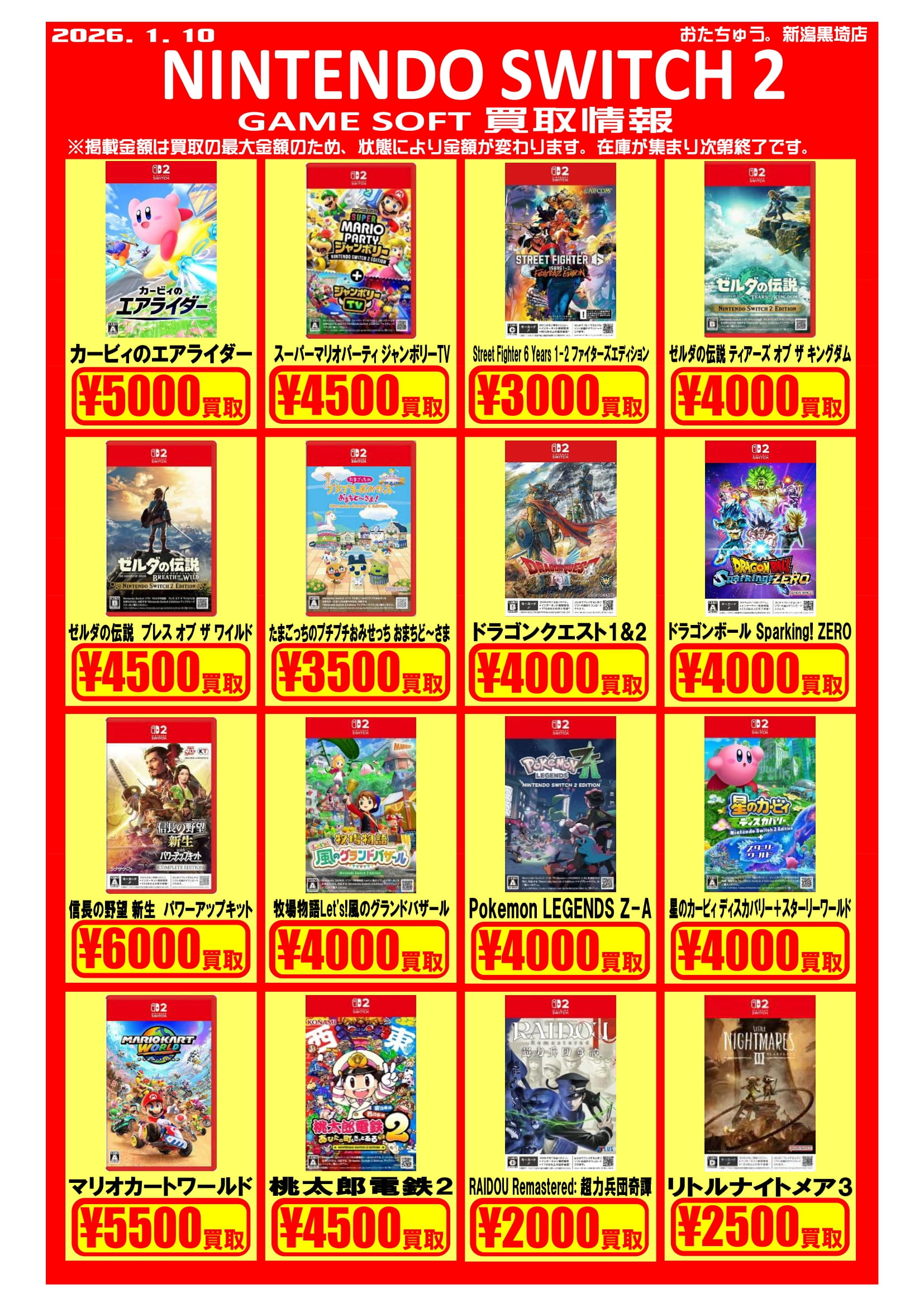 ✨ゲームソフト買取チラシを更新しました✨ 2026年1月10日ゲームソフトの買取チラシを更新いたしました! 遊び終わったソフトはぜひおたちゅう新潟黒埼店にお売りください✨ お待ちしております😊※2026/1/10現在の価格となります。在庫状況・状態によってお値段が変動いたします。予めご了承ください。****************こちら↓もぜひチェックしてみてくださいね♪(*´▽`*)・最新のイベント情報はこちら・最新の買取情報はこちら