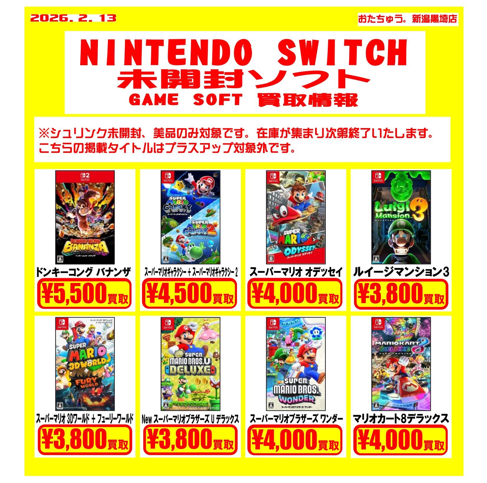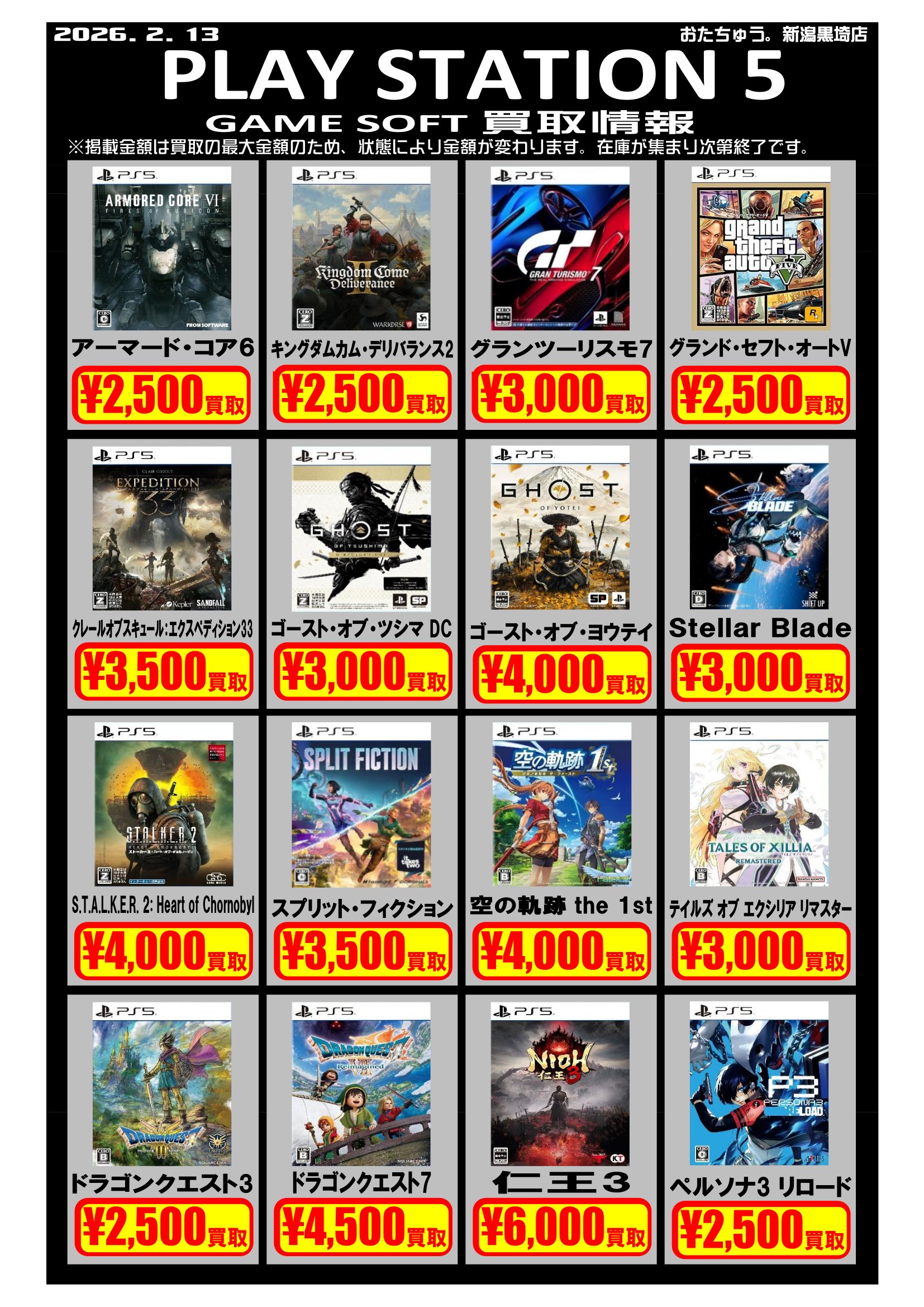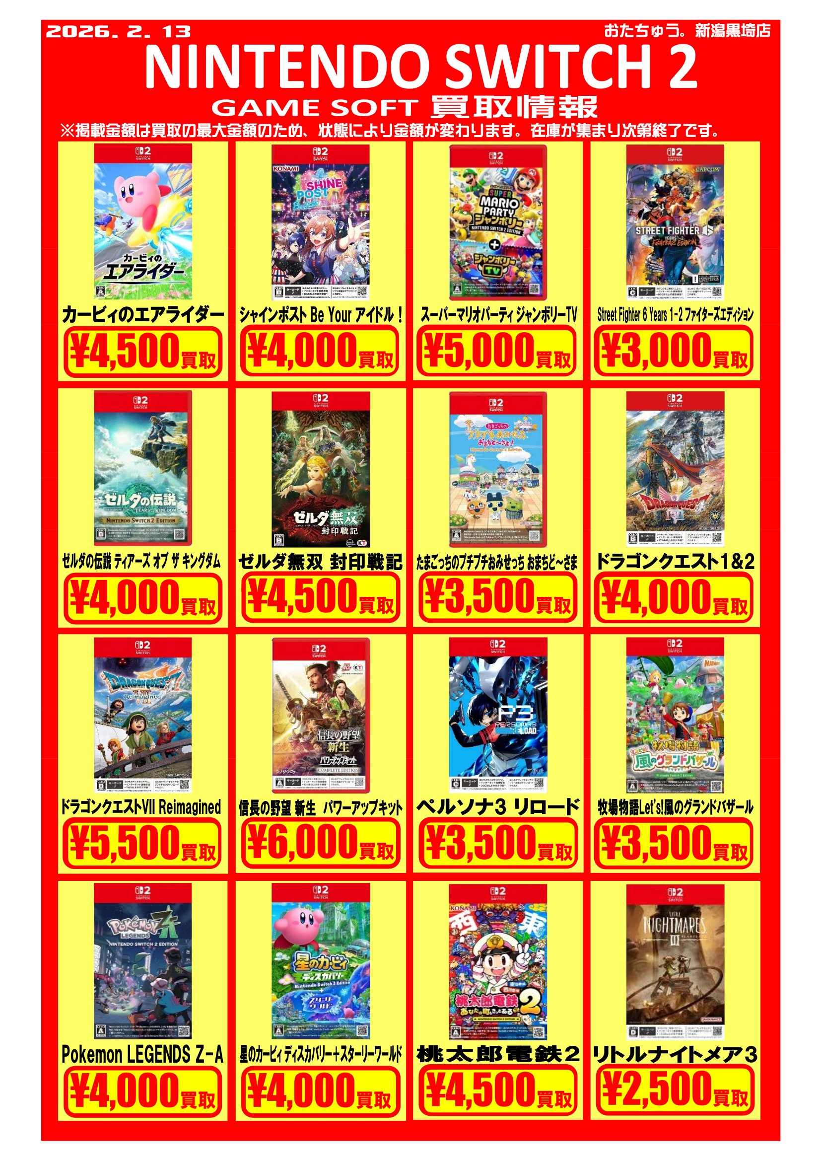 ✨ゲームソフト買取チラシを更新しました✨ 2026年2月13日ゲームソフトの買取チラシを更新いたしました! 遊び終わったソフトはぜひおたちゅう新潟黒埼店にお売りください✨ お待ちしております😊※2026/2/13現在の価格となります。在庫状況・状態によってお値段が変動いたします。予めご了承ください。****************こちら↓もぜひチェックしてみてくださいね♪(*´▽`*)・最新のイベント情報はこちら・最新の買取情報はこちら