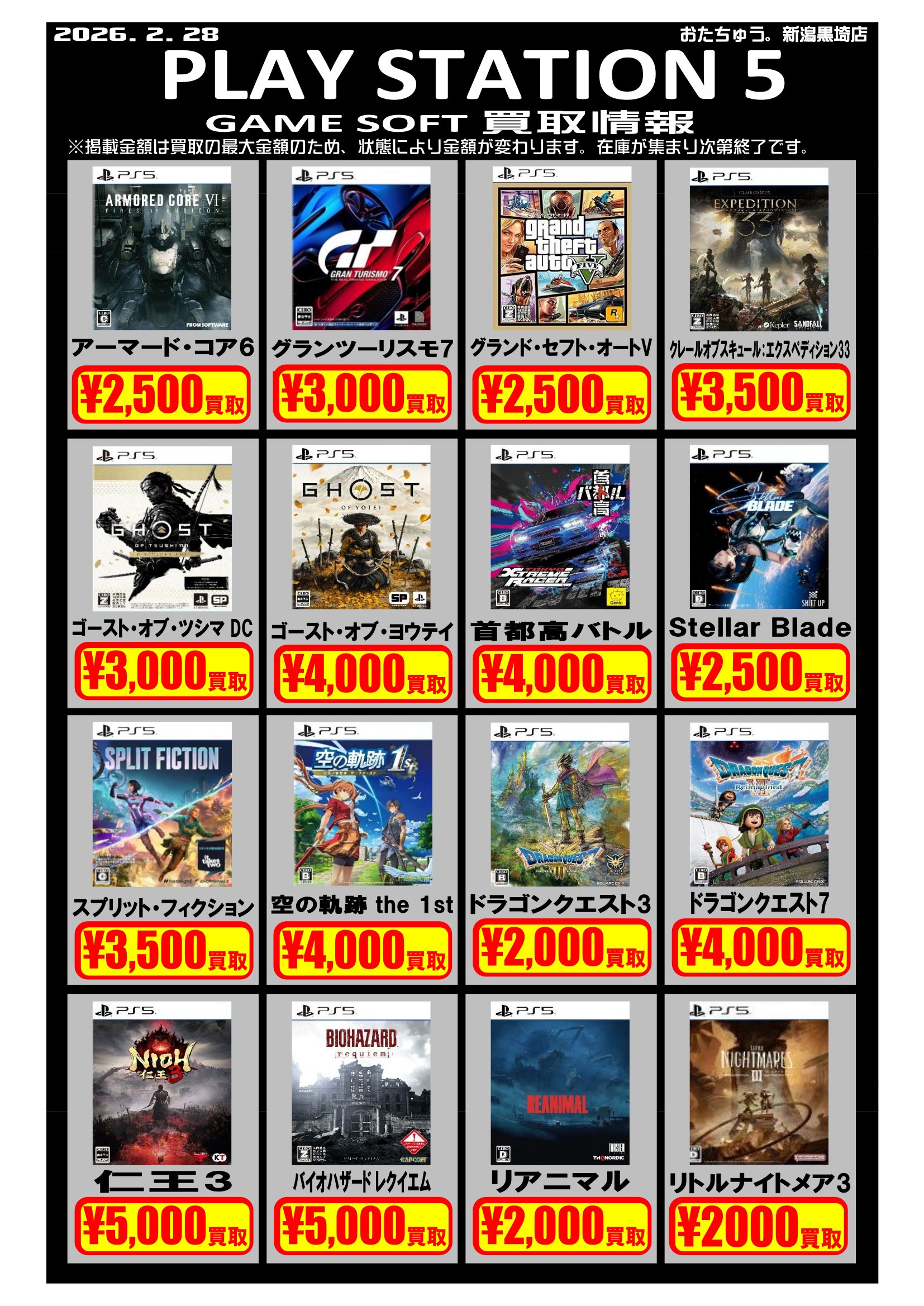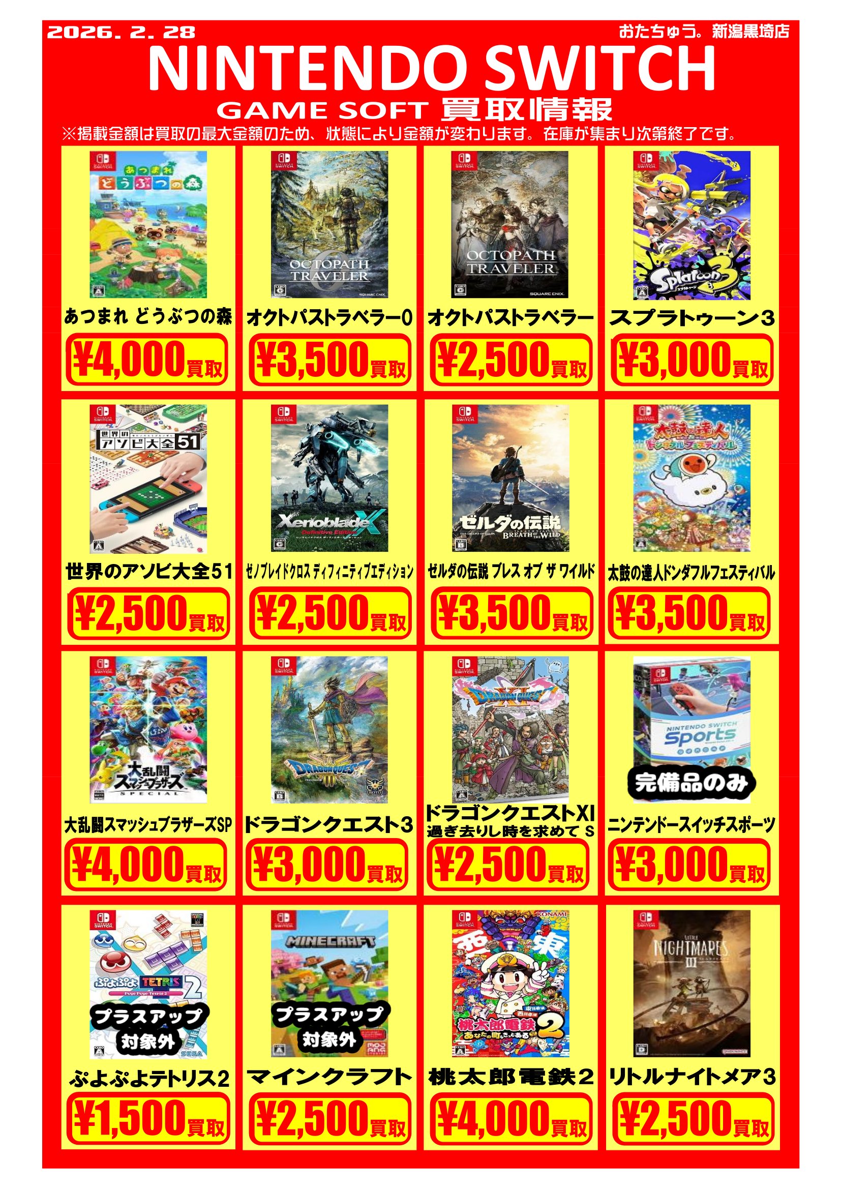 ✨ゲームソフト買取チラシを更新しました✨ 2026年2月27日 ゲームソフト買取チラシを更新しました 遊び終わったソフトはぜひおたちゅう新潟黒埼店にお売りください✨ お待ちしております😊 ※2026/2/27現在の価格となります。 在庫状況・状態によってお値段が変動いたします。予めご了承ください。****************こちら↓もぜひチェックしてみてくださいね♪(*´▽`*)・最新のイベント情報はこちら ・最新の買取情報はこちら
