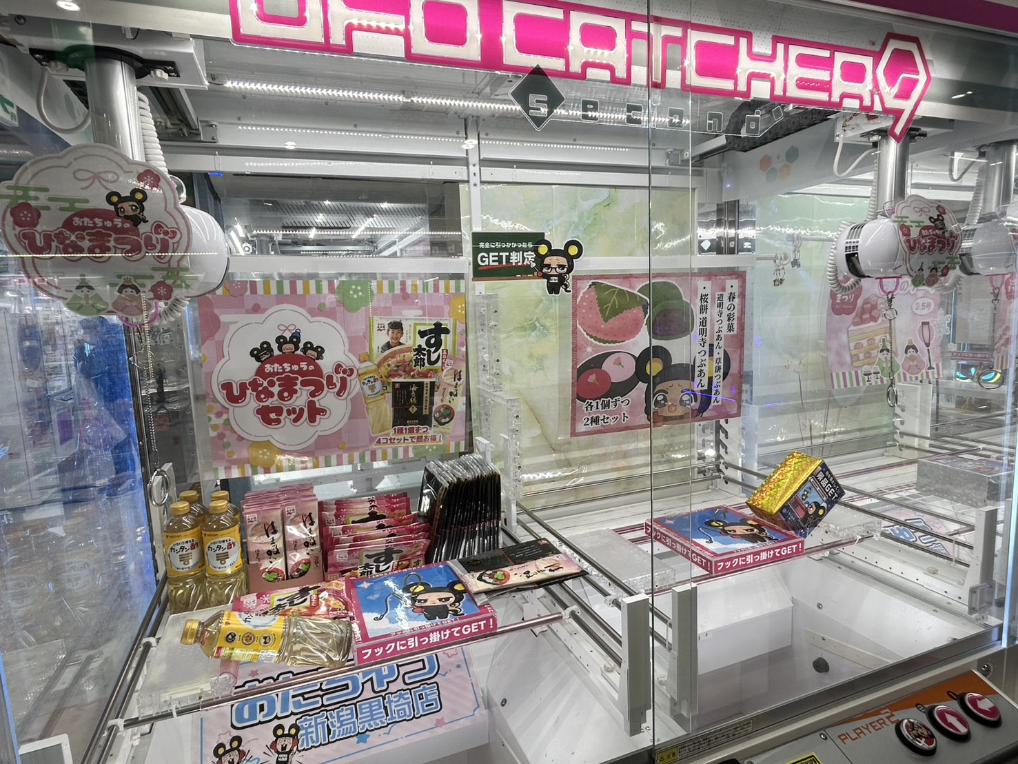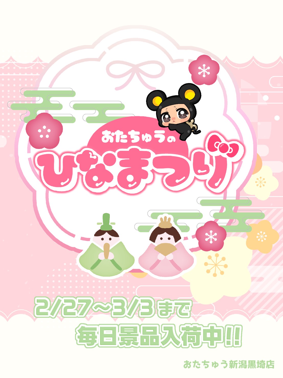 ひな祭りスタート🎎✨ 2026年2月28日 みなさんこんにちは☀️ 本日よりおたちゅう新潟黒埼店のひなまつりがスタート✨ ・ひなまつり 桃のケーキ ・ひなまつり 苺のケーキ ・春の和菓子セット ・ちらし寿司セット こちらの景品が3/3まで毎日入荷致します(っ*ˊ ᵕ ˋ*c)特にケーキは大人気なので早めにゲットしにくる事をオススメします✨ぜひ春の訪れを楽しんでください🌸 ご来店お待ちしております♩