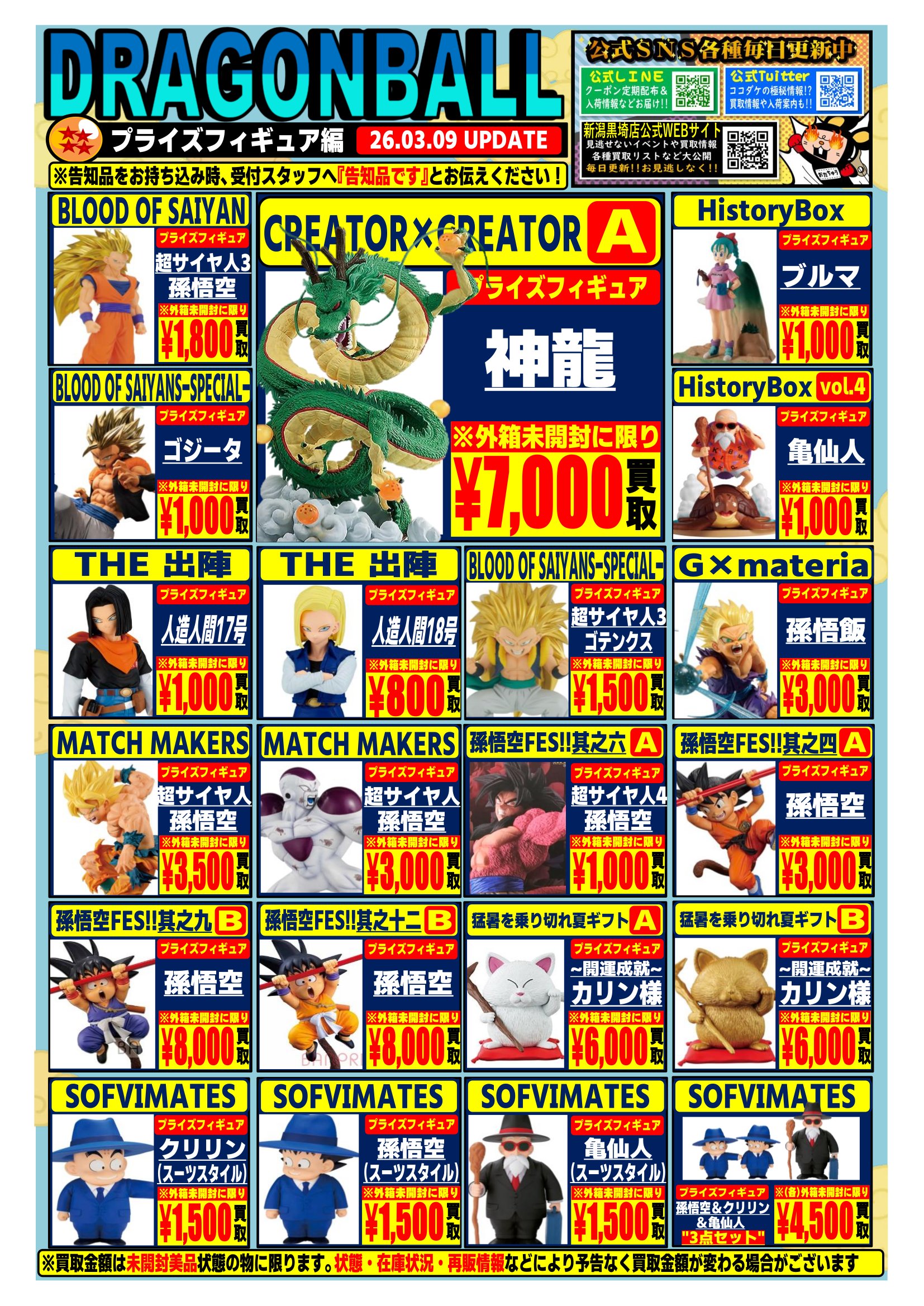 ■おもちゃ3月買取告知情報🐲■ 2026年3月9日 おもちゃ部門より ドラゴンボールのプライズフィギュア&ガンプラ告知を一部更新いたしました! 今月もたくさんのグッズや大人気アミューズメント景品を揃えて皆さまのご来店を心よりお待ちしております! ——————————————— 詳細は各ウェブチラシにて記載しております。 お持ち込み前に一度ご確認をお願いいたします ———————————————※2026/3/9 現在の価格となります。 在庫状況・状態によってお値段が変動いたします。予めご了承ください。