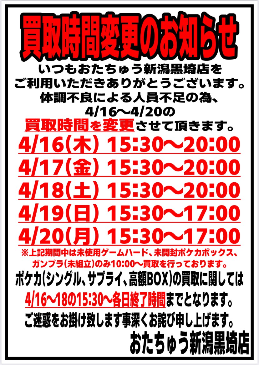 【重要】《1月21日より》買取時間の変更ついて【重... ★いつもおたちゅう新潟黒埼店をご利用頂きありがとうございます。 2026年1月21日からの営業時間変更に伴い、...