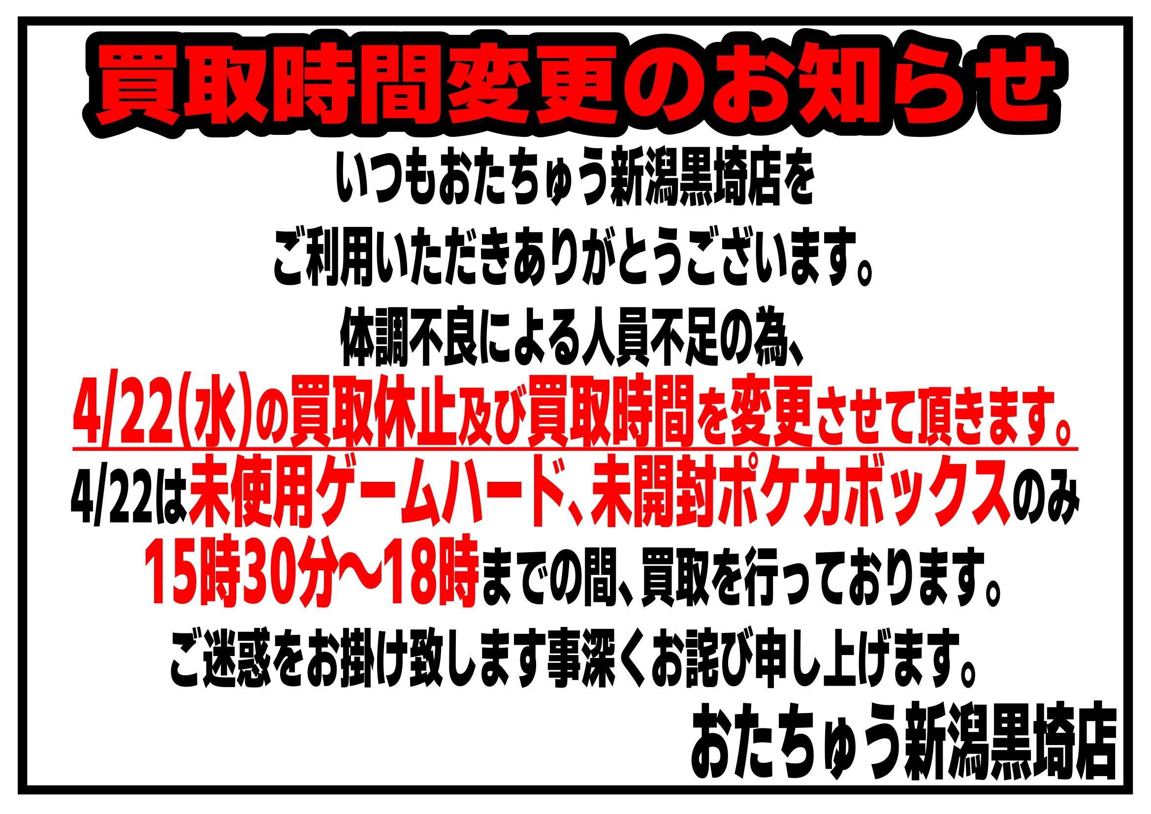 【重要】《1月21日より》買取時間の変更ついて【重... ★いつもおたちゅう新潟黒埼店をご利用頂きありがとうございます。 2026年1月21日からの営業時間変更に伴い、...