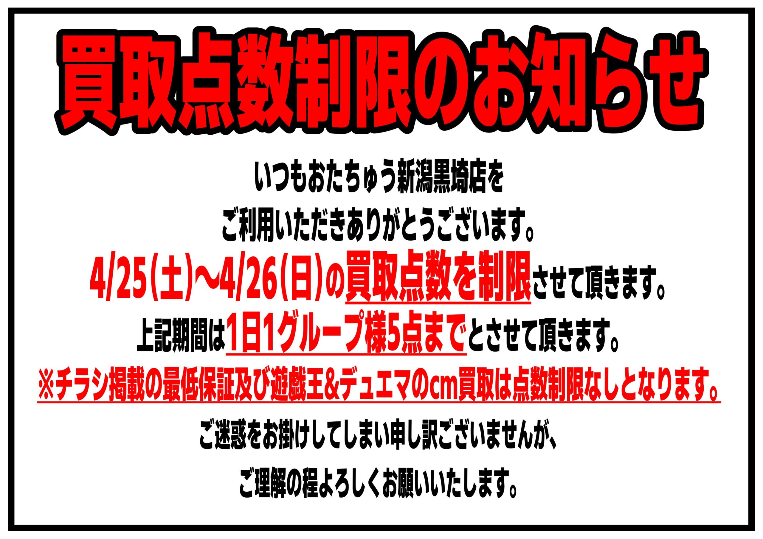 4/25(土)〜4/26(日)の買取に関して 2026年4月25日★お知らせ★いつもおたちゅう新潟黒埼店をご利用いただきありがとうございます。連休中の査定混雑緩和のために 4/25(土)〜4/26(日)の買取点数を制限させて頂きます。 上記期間中は1日1グループ様5点までとさせて頂きます。※チラシ掲載の最低買取保証及び遊戯王&デュエマのcm買取は点数制限なしとなります。ご迷惑ご不便をおかけしてしまい申し訳ありませんが、ご理解の程よろしくお願いします。