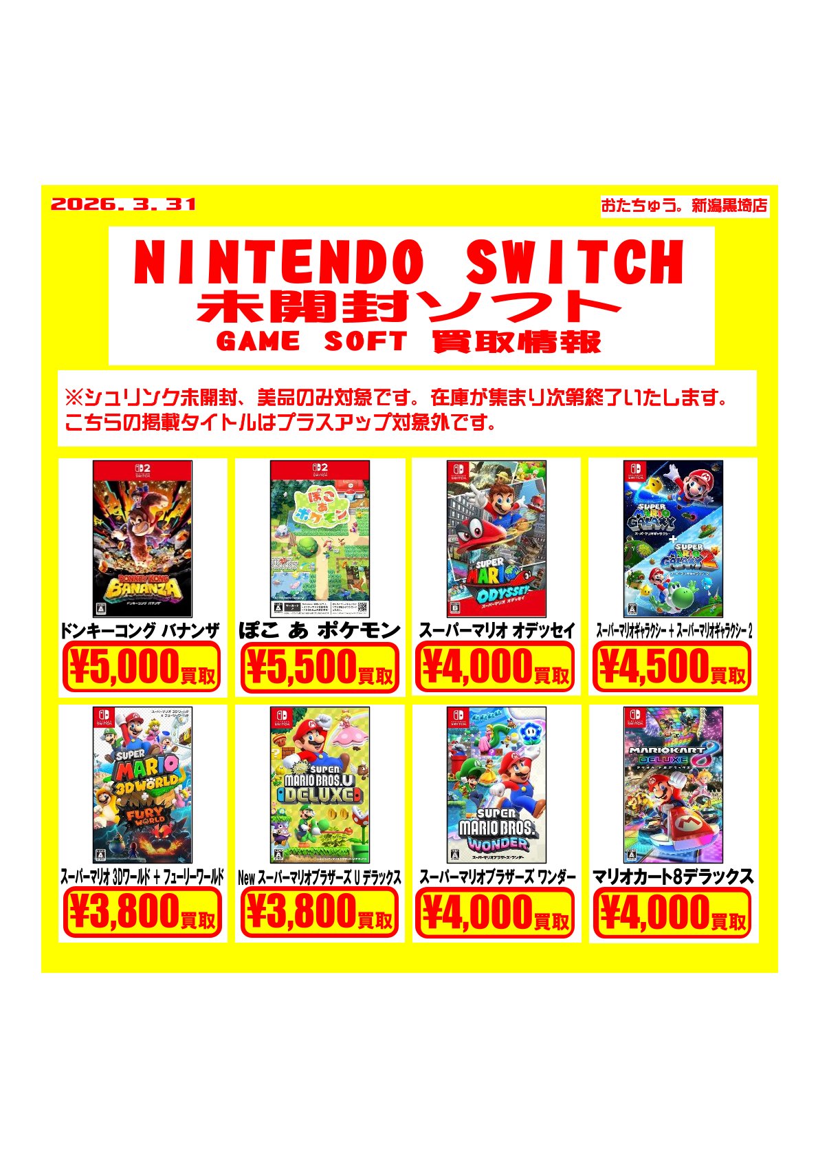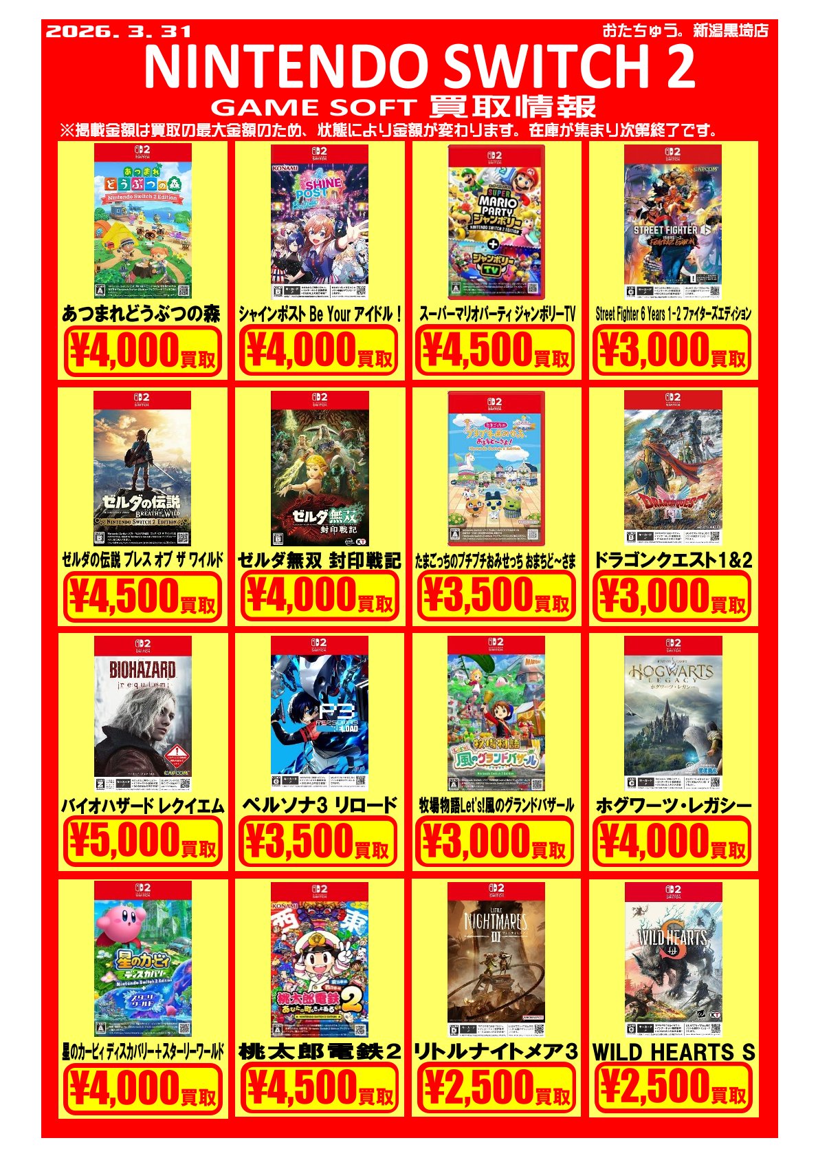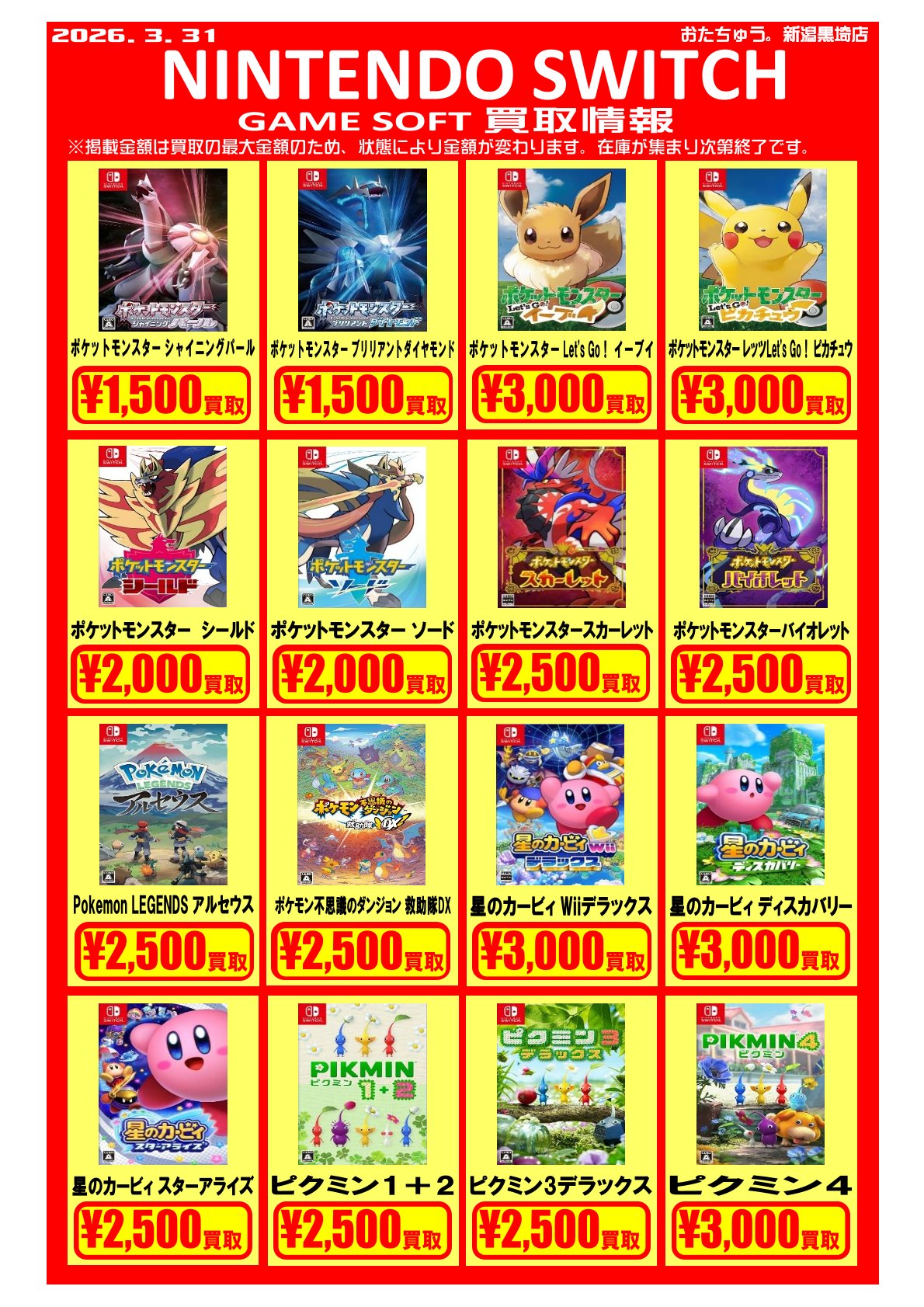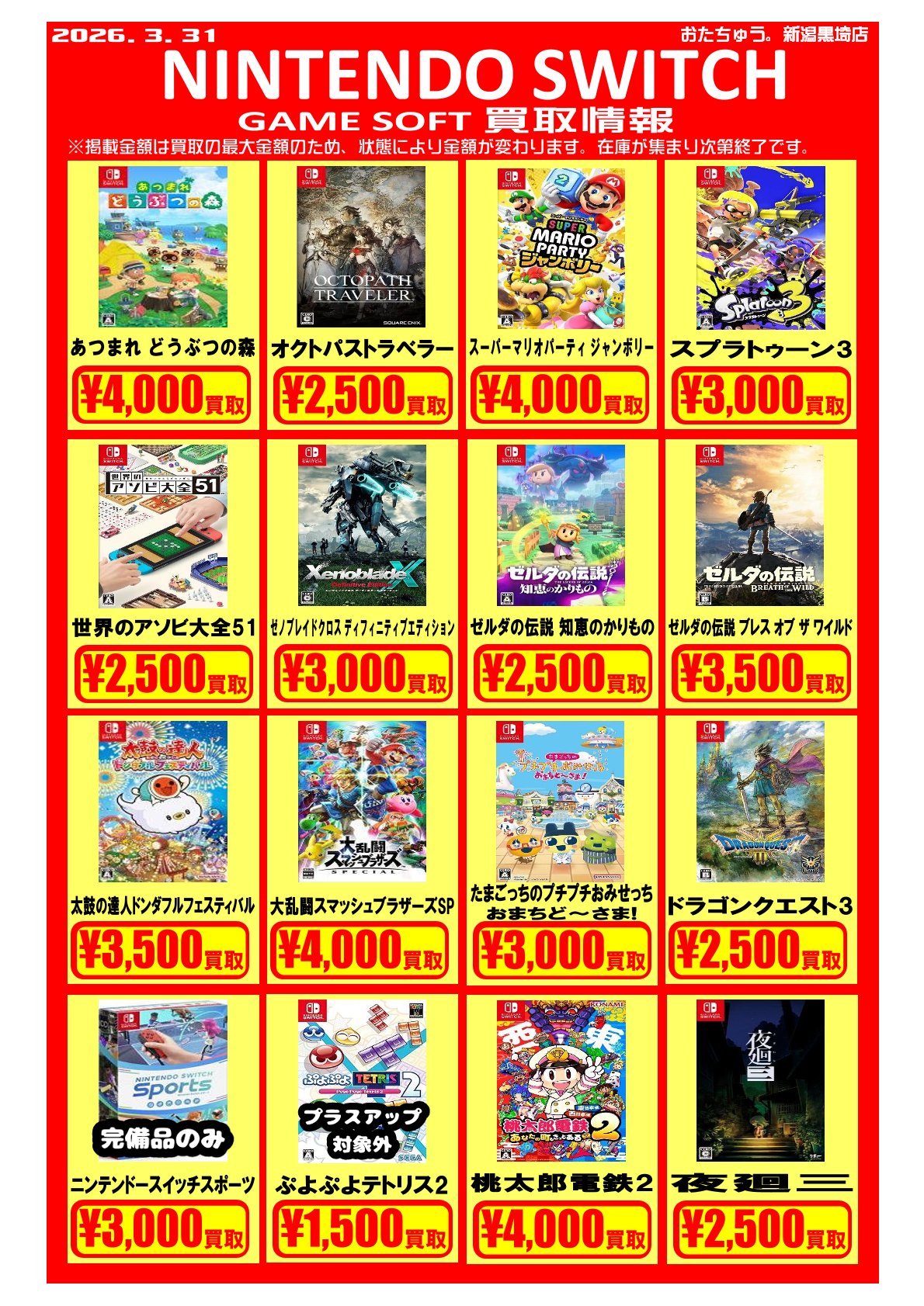 ✨ゲームソフト買取チラシを更新しました✨ ゲームソフトの買取チラシを更新いたしました! 遊び終わったソフトはぜひおたちゅう新潟黒埼店にお売りください✨...
