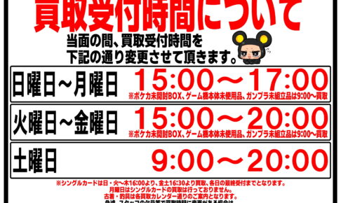 買取情報いつもおたちゅう新潟黒埼店をご利用頂きありがとうございます。 今後の買取時間を以下に変更させて頂きます。 日曜〜月曜 15:00~17:00 火曜〜金曜 15:00~20:00 土曜 9:00~20:00 ※シングルカー…